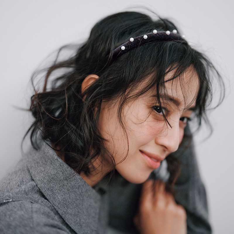 大人もつけやすい細身のベロアカチューシャ×小粒パール。エンド部分にあしらわれたミニリボンで、横顔もチャーミングな印象に。