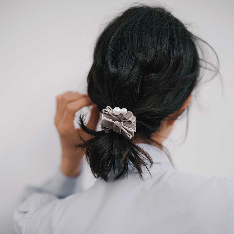 ベロアリボンに大小のパールがリズミカルにあしらわれたサテンシュシュ。普段使いしやすいミニサイズで、子どもとお揃いを楽しめるのもポイント。