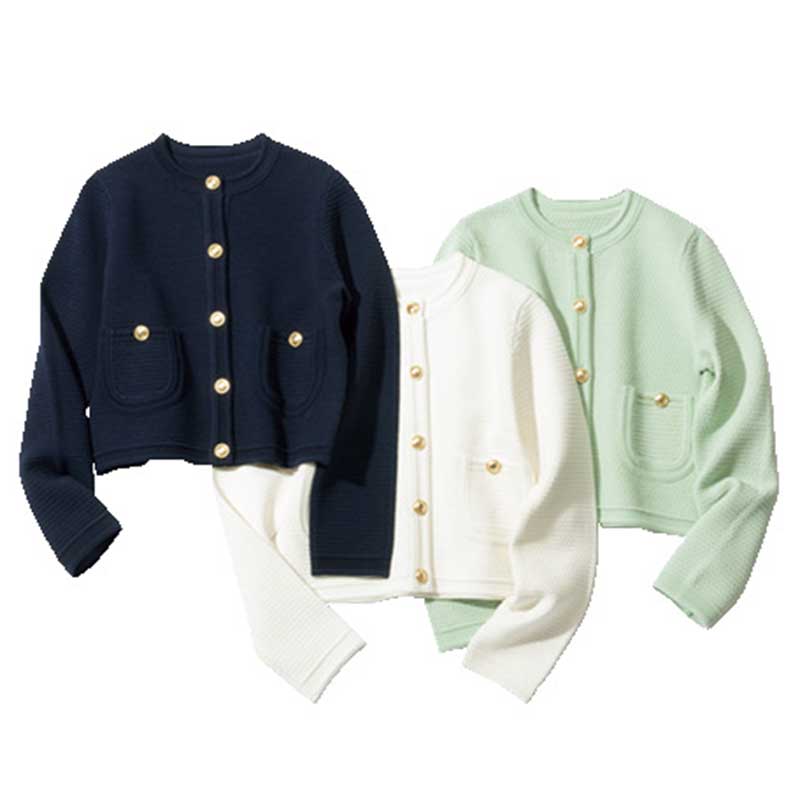 ラーベン編みならではの凹凸がツイード風の高級感を演出。ブランドオリジナルの上品な金釦はコーデのアクセントに。水洗い可。