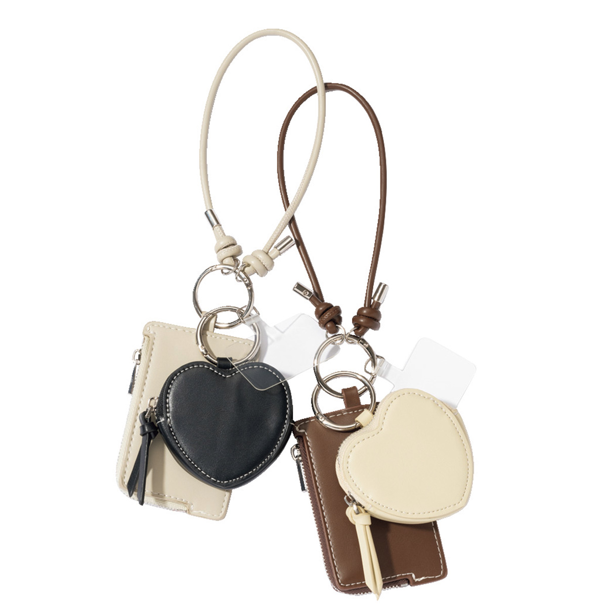 スマホホルダーシート、カードケース、ハートポーチがセットに。手持ちのバッグにチャームとして付けるのもおすすめ。