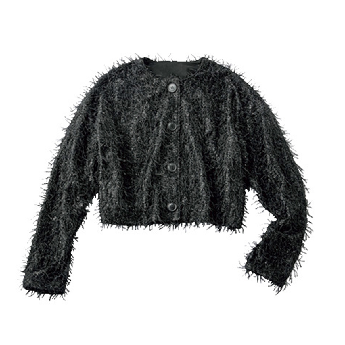 ラメ入りの毛足長めなシャギー素材を使用。裏地が付いていないため、薄手のニットの上からでもすっきり着られます。手洗い可。
