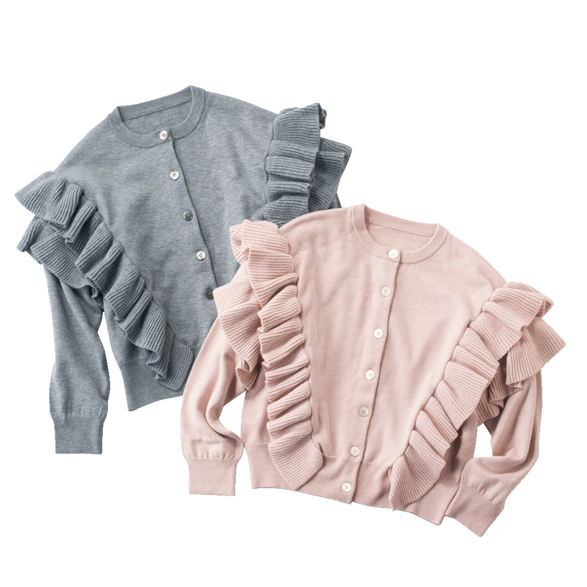 柔らかな感触のニットだから、秋はもちろん、真冬だって大活躍。羽織りとしてだけでなく、前を閉じてプルオーバー風に着るのもおすすめ。肩から前身頃にかけてリブに編んだ2段のフリルが加わることで、主役級の華やかさ。さらにハイゲージカーデだと露わになりがちな体のラインを上手にカモフラージュしてくれます。身頃も袖もゆったりシルエット。