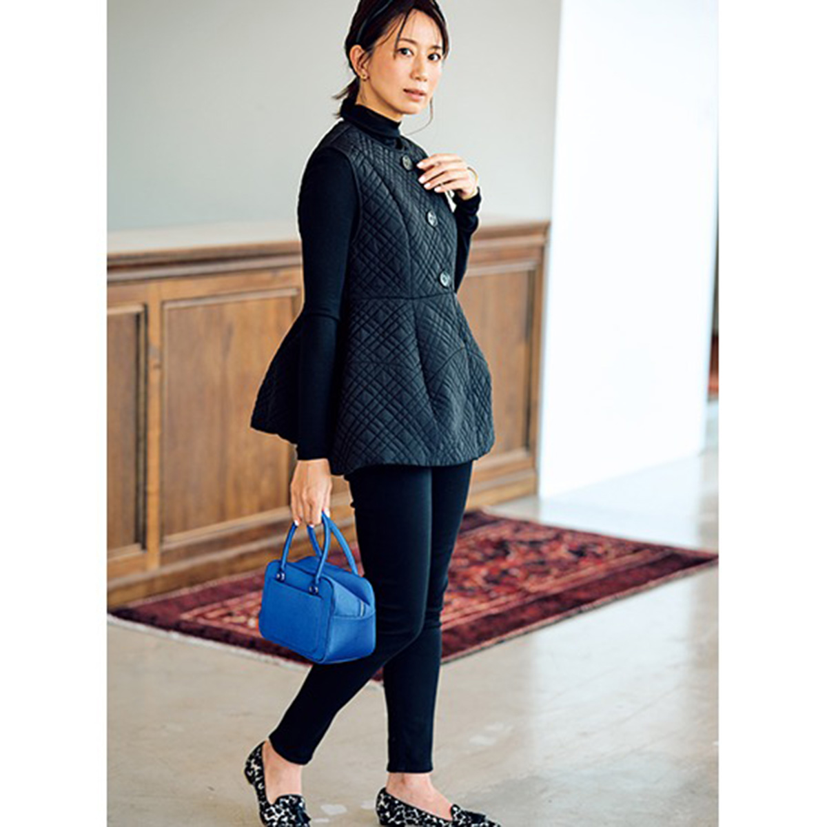 まず絶対挑戦したいのは、今年もますます人気のハイネックニット合わせ。オールブラックでもスタイリッシュに仕上がります。シャツやブラウスに合わせても好バランスです。