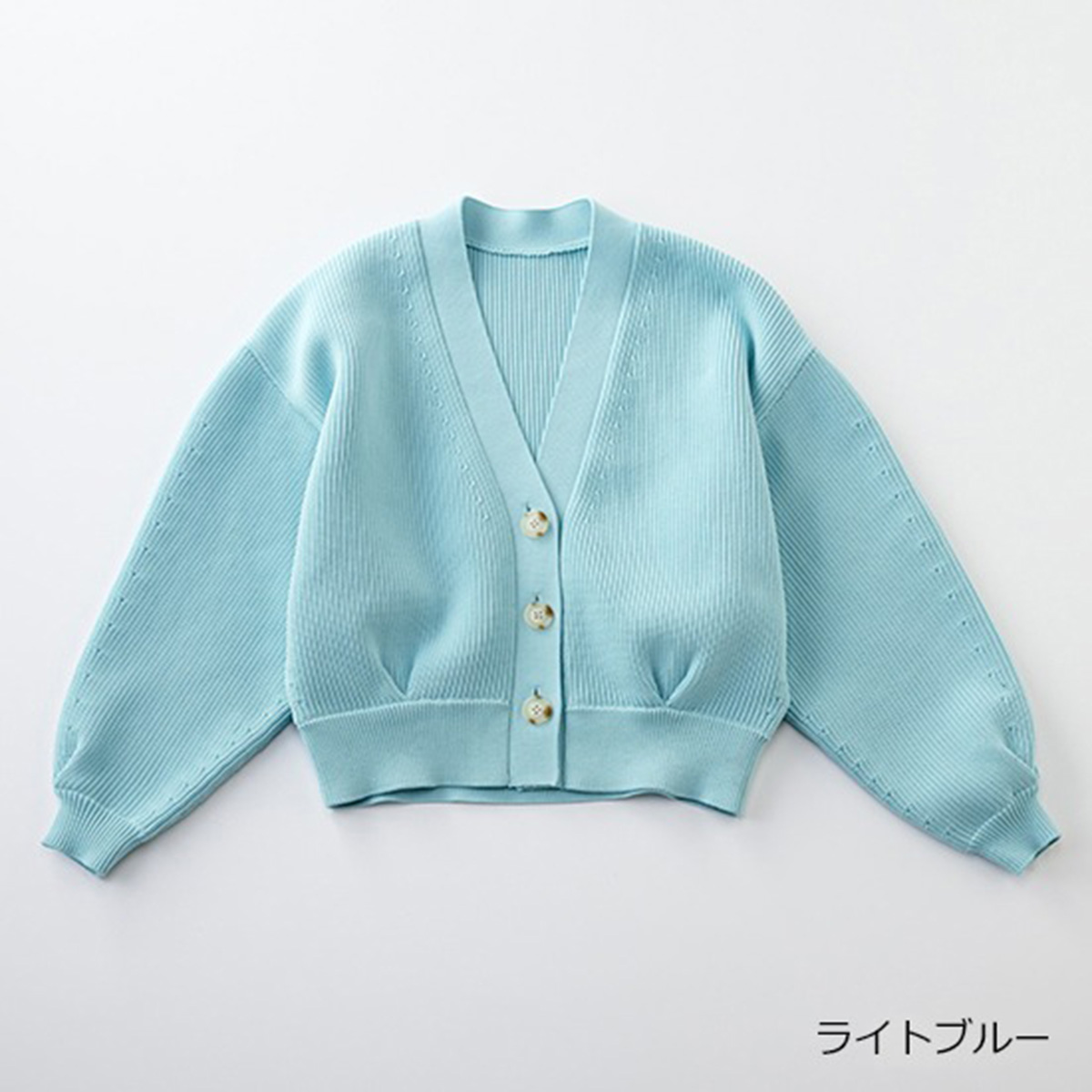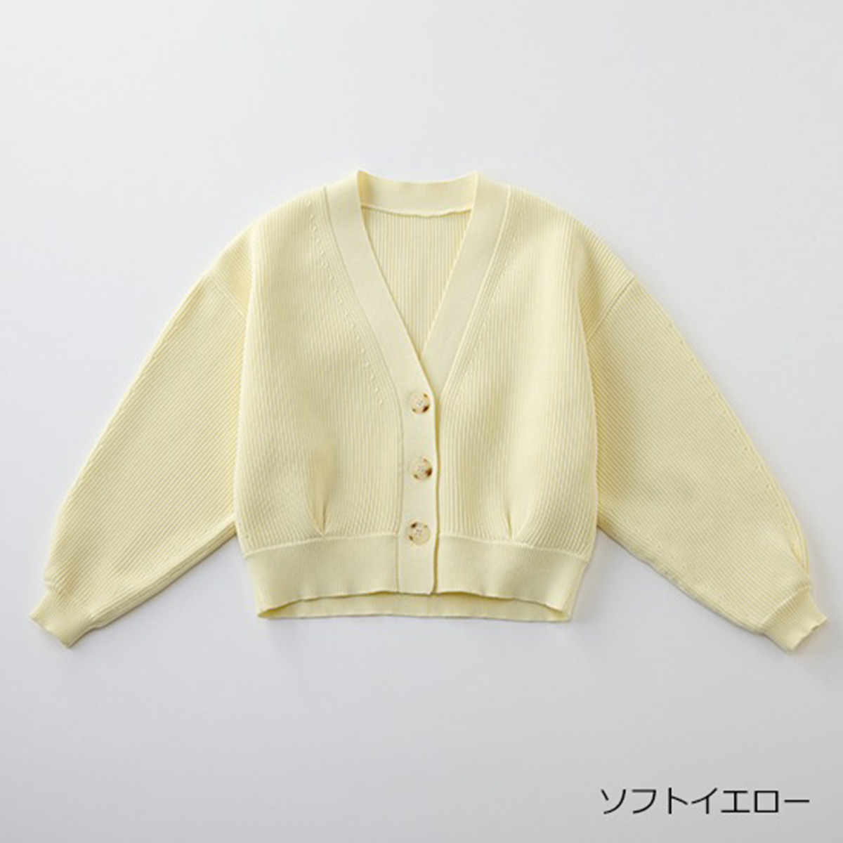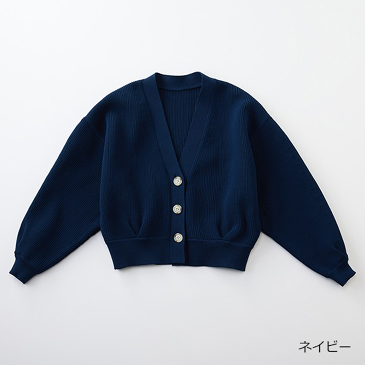 ふっくら感があるのに着ているのを忘れるくらい軽い糸を使用した短め丈カーデ。定番のネイビーと、春らしく優しげな印象のキレイ色2色をご用意。裾や袖口にタックを入れることでふんわりと、ボリューム袖にも羽織りやすい一枚に。