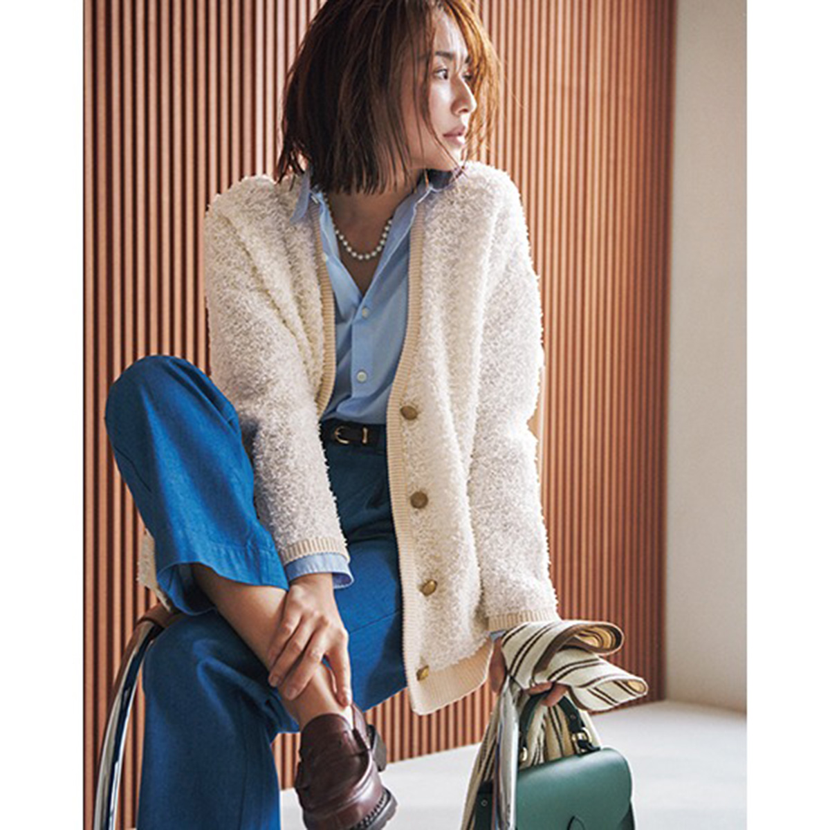春にピッタリなドライな質感のニット。表情のある表面感で、コーデが単調になるのを防いでくれる技ありカーデ。メンズライクなシャツスタイルのほか、ふんわりスカートなどフェミニンな装いにもマッチ!