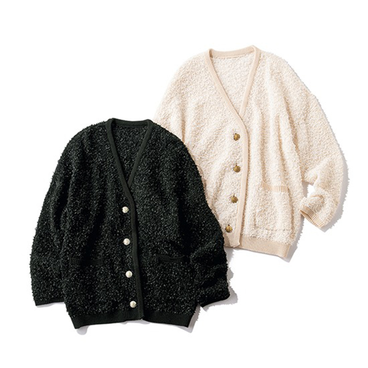 カーディガンが単なる防寒対策用にならず、コーデの肝になれる一着がほしくてデザインしました!異素材テープヤーンが織り込まれたゆるりとしたカーディガン。ボタンはエクリュがゴールド、ブラックはシルバー。