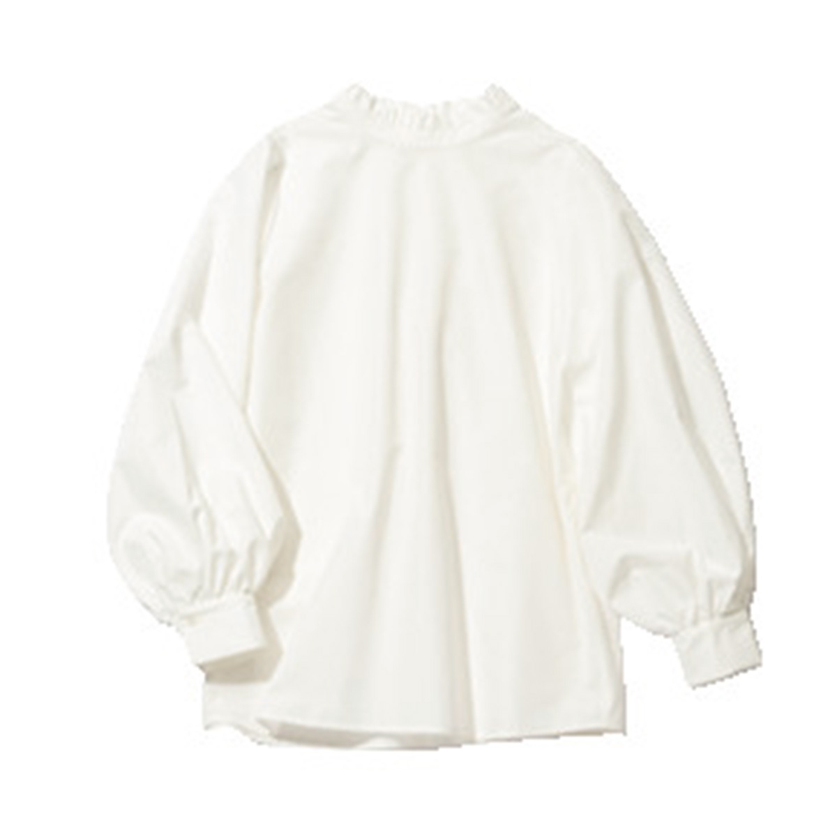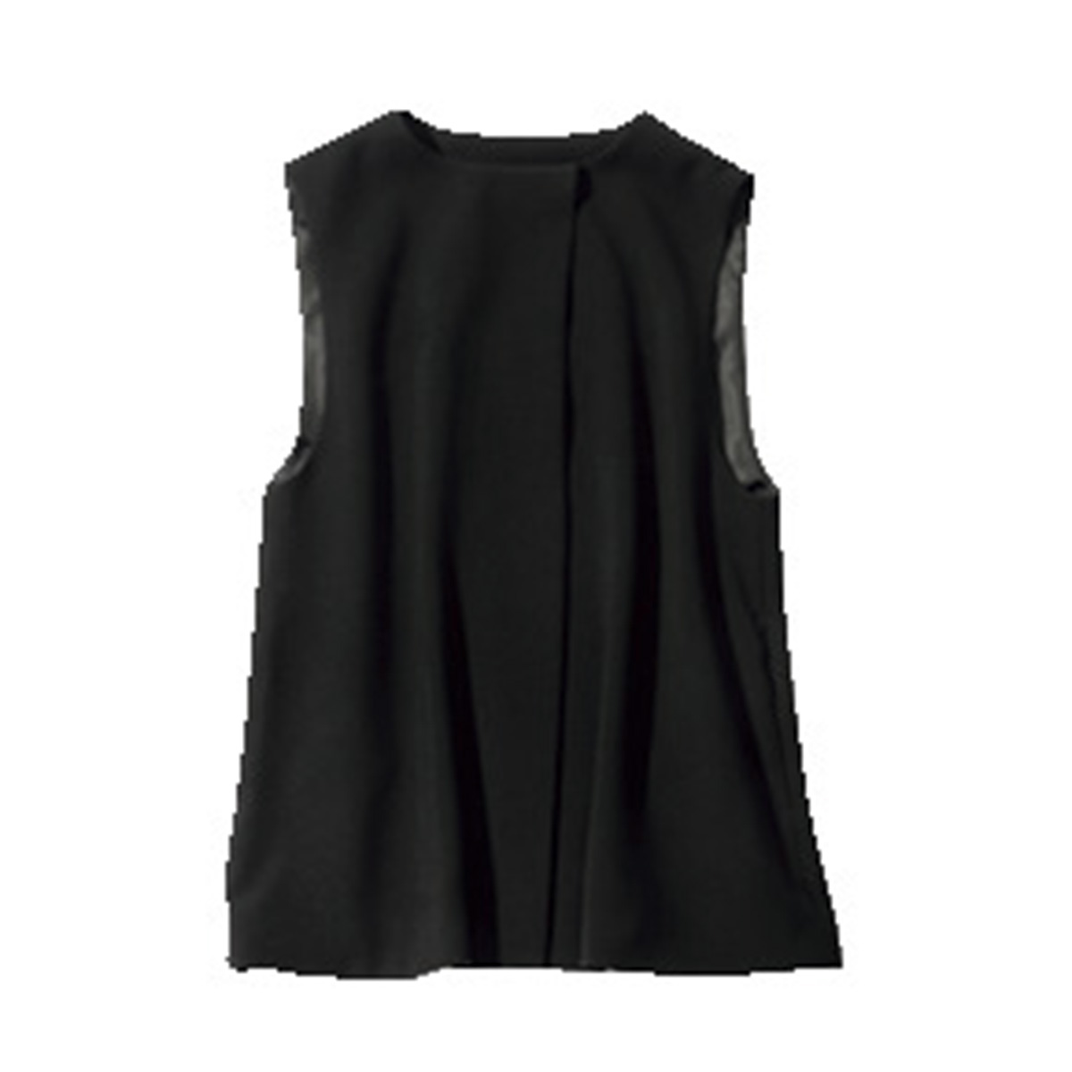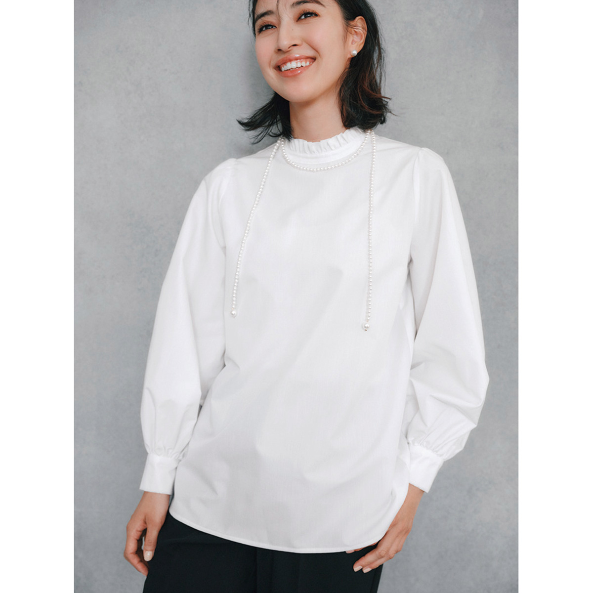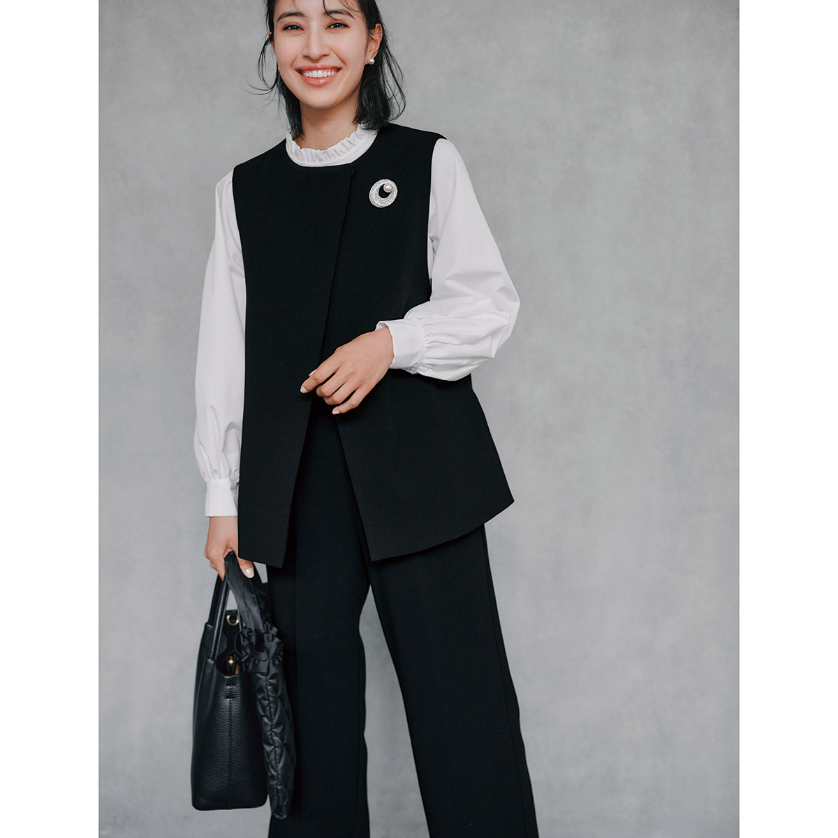 同素材のジレとパンツが生み出す統一感に、フリルスタンド衿のブラウスが華やかさをプラス。スムースな表面感が品格を生む。洗濯機洗いOK。