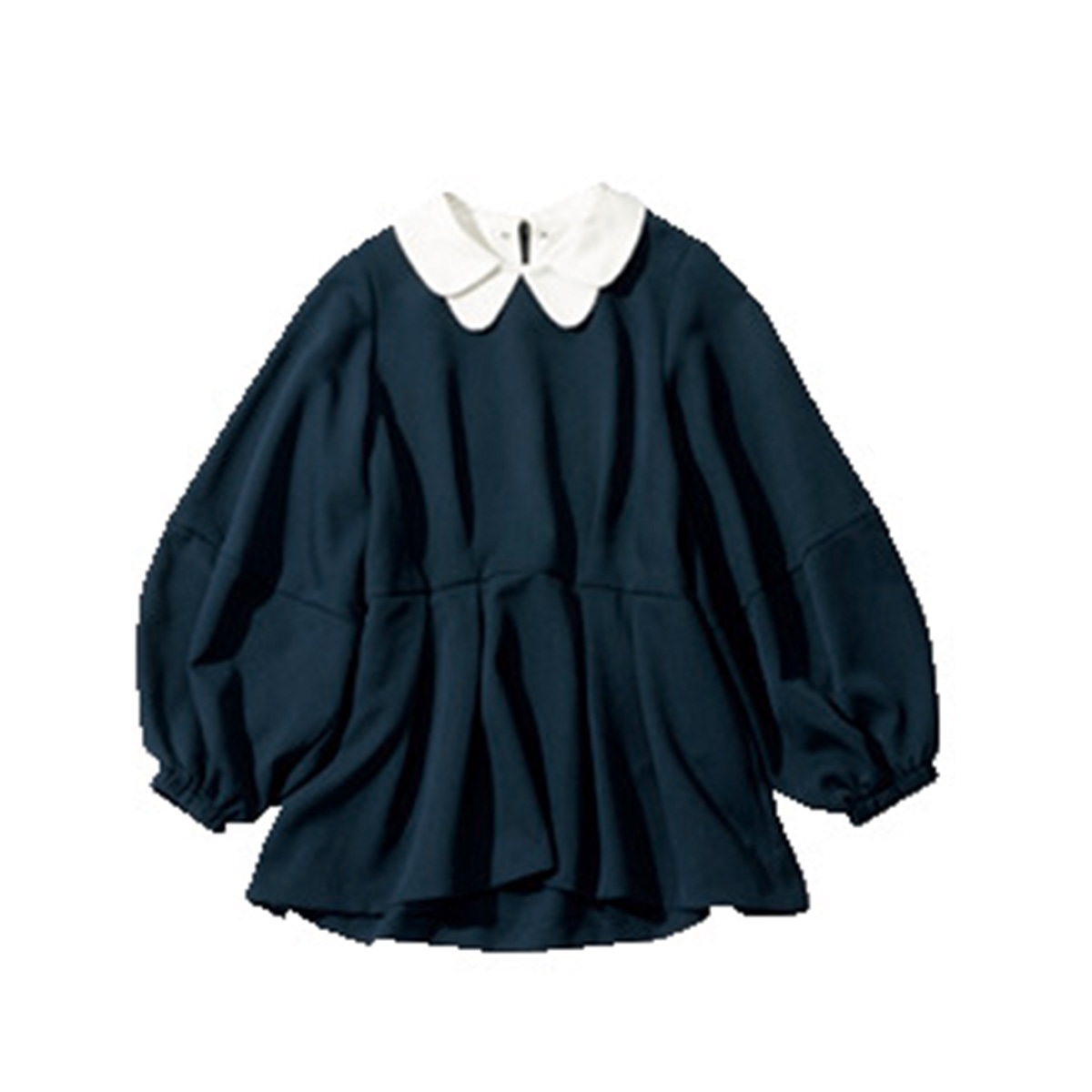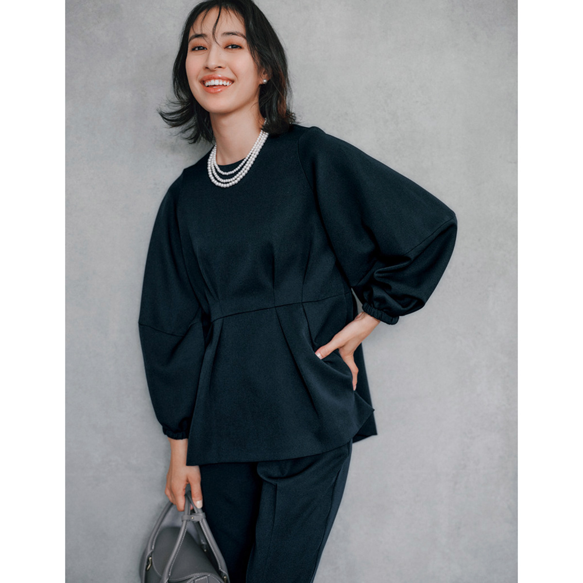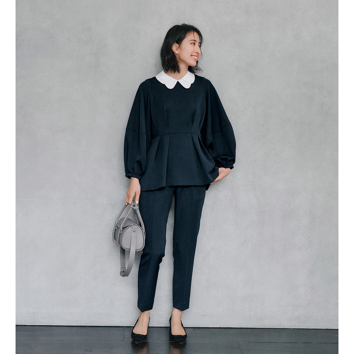 甘さときちんと感の絶妙なバランスが嬉しいセットアップの最大の魅力は、花びらのように重なる白い衿。取り外し可能だから、シーンに応じてスタイルチェンジが自在。テーパードシルエットの九分丈パンツは、足首見せで抜け感をプラス。ウエスト後ろゴム入りで着心地も快適。