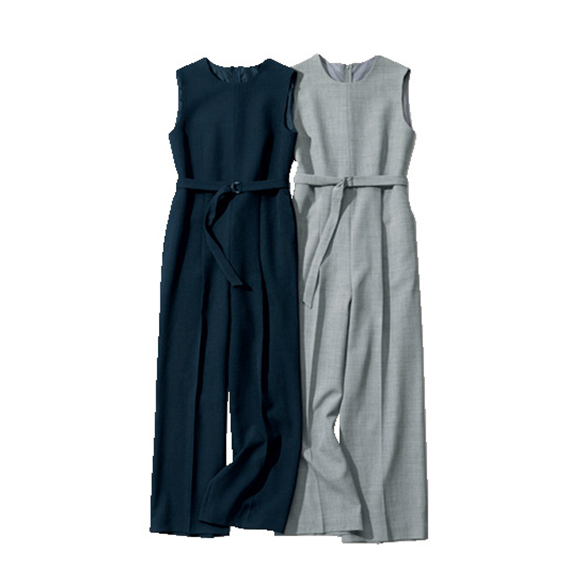 春から秋まで長く着られるサラッとした生地で、杢調なのも高級感を演出。ジャケットもオールインワンも洗濯機で洗えるという利便性も◎。
