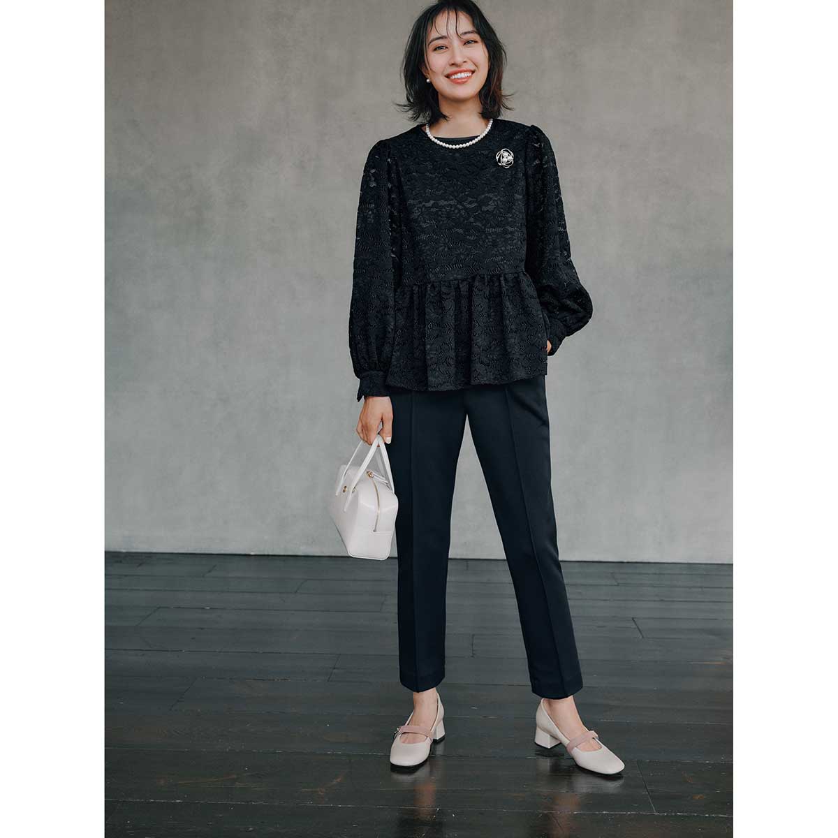 ブラウス¥19,800パンツ¥17,600(ともにスリースクエア)ネックレス&ピアス[セット販売]¥3,850ブローチ¥6,600(ともにVS セレクション)バッグ¥38,500(ルメメ)パンプス¥9,900(チャールズ&キース/チャールズ&キース ジャパン)