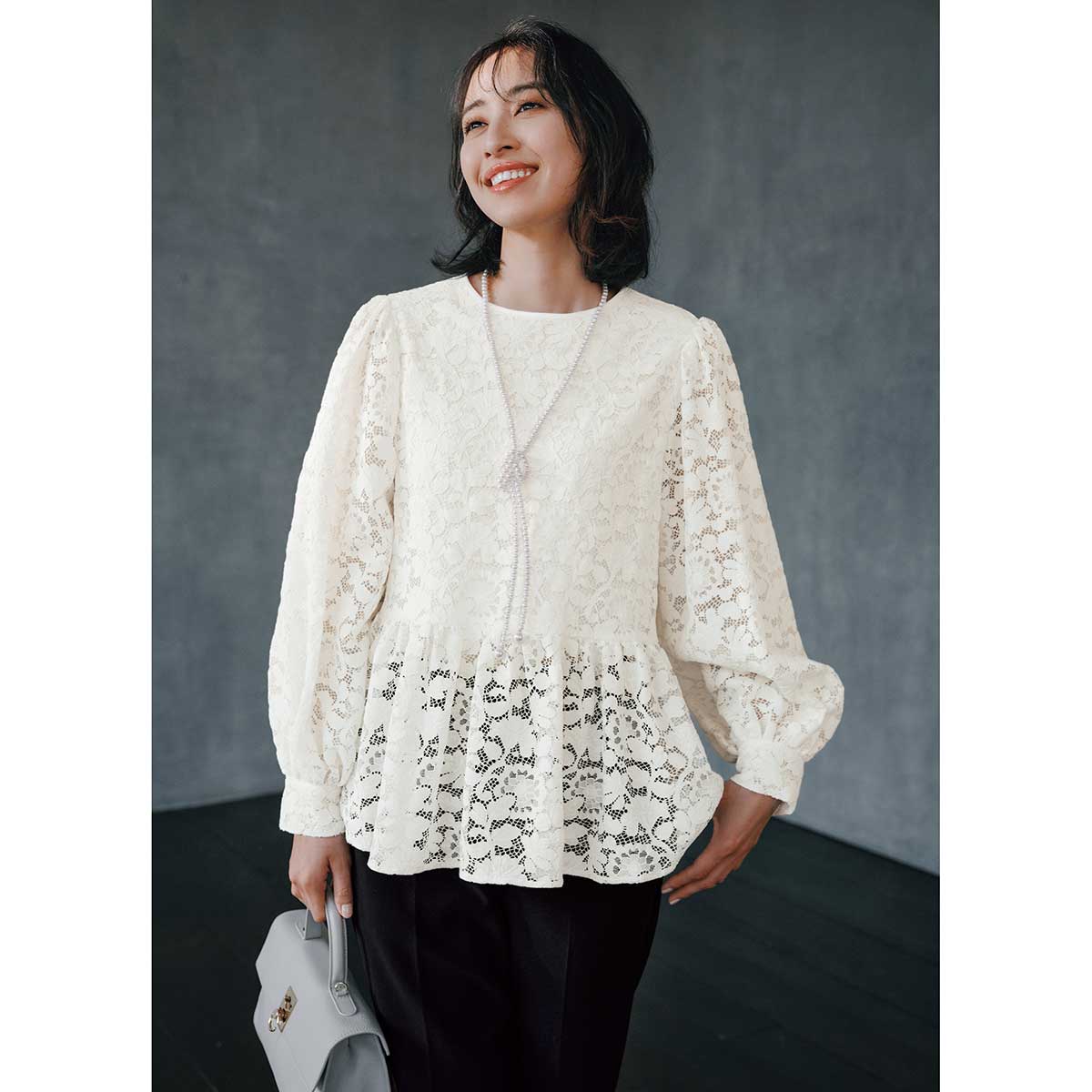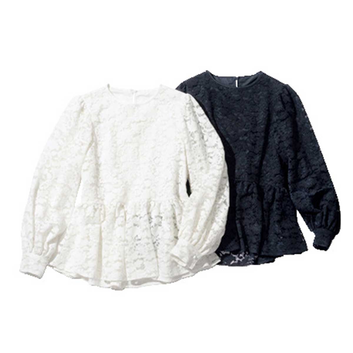 ペプラムデザインのレースブラウス。袖とペプラムにはあえて裏地をつけず、透け感を活かすことで軽やかで今っぽい印象に。