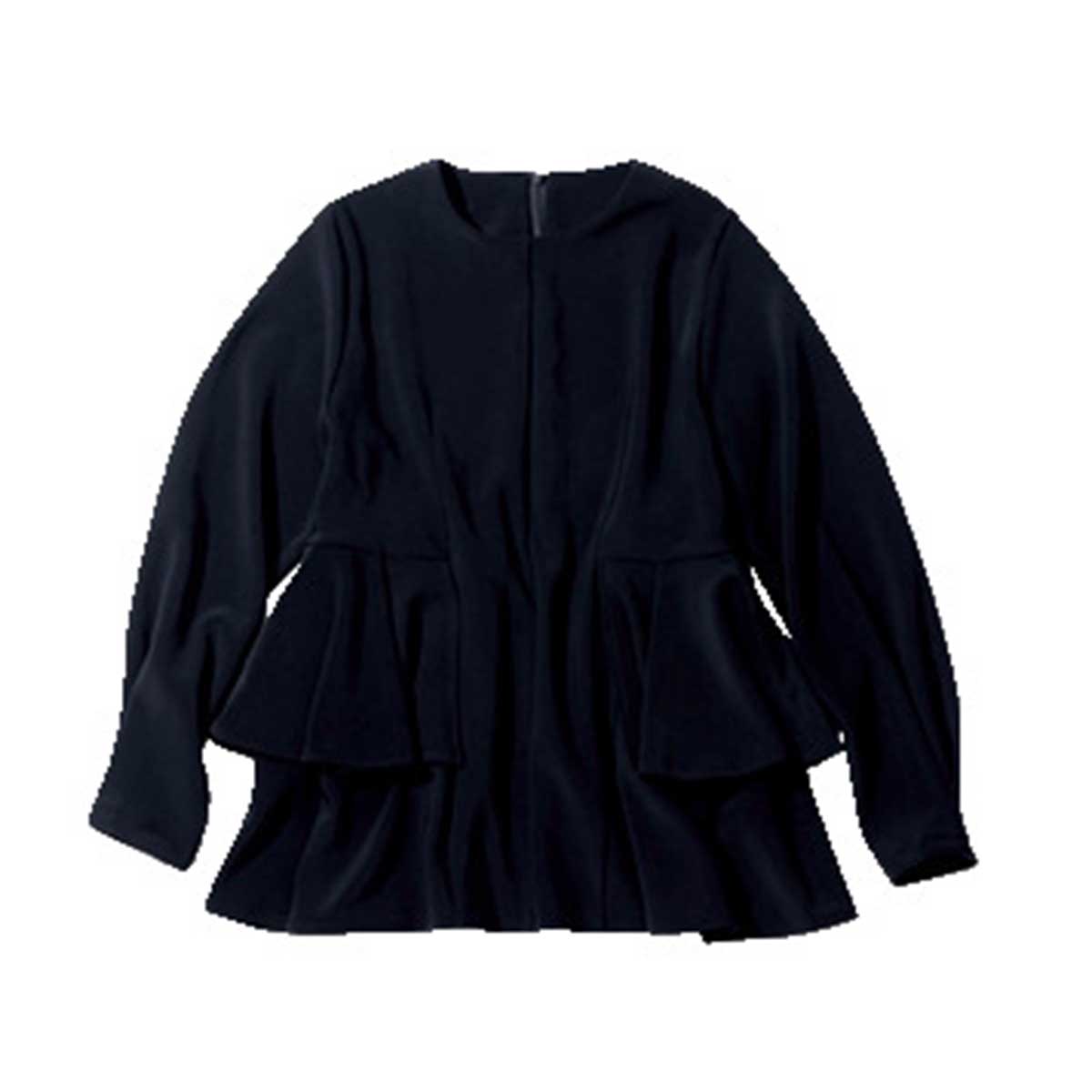 ジャージー素材のストレッチ性が快適な着心地のブラウス。サイドに配された段々のフレアから生まれるペプラムシルエットが特徴。