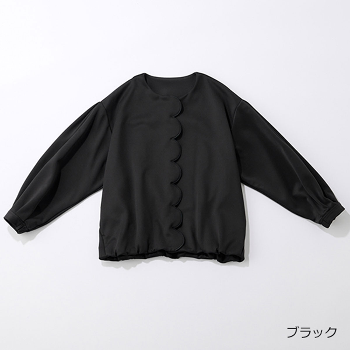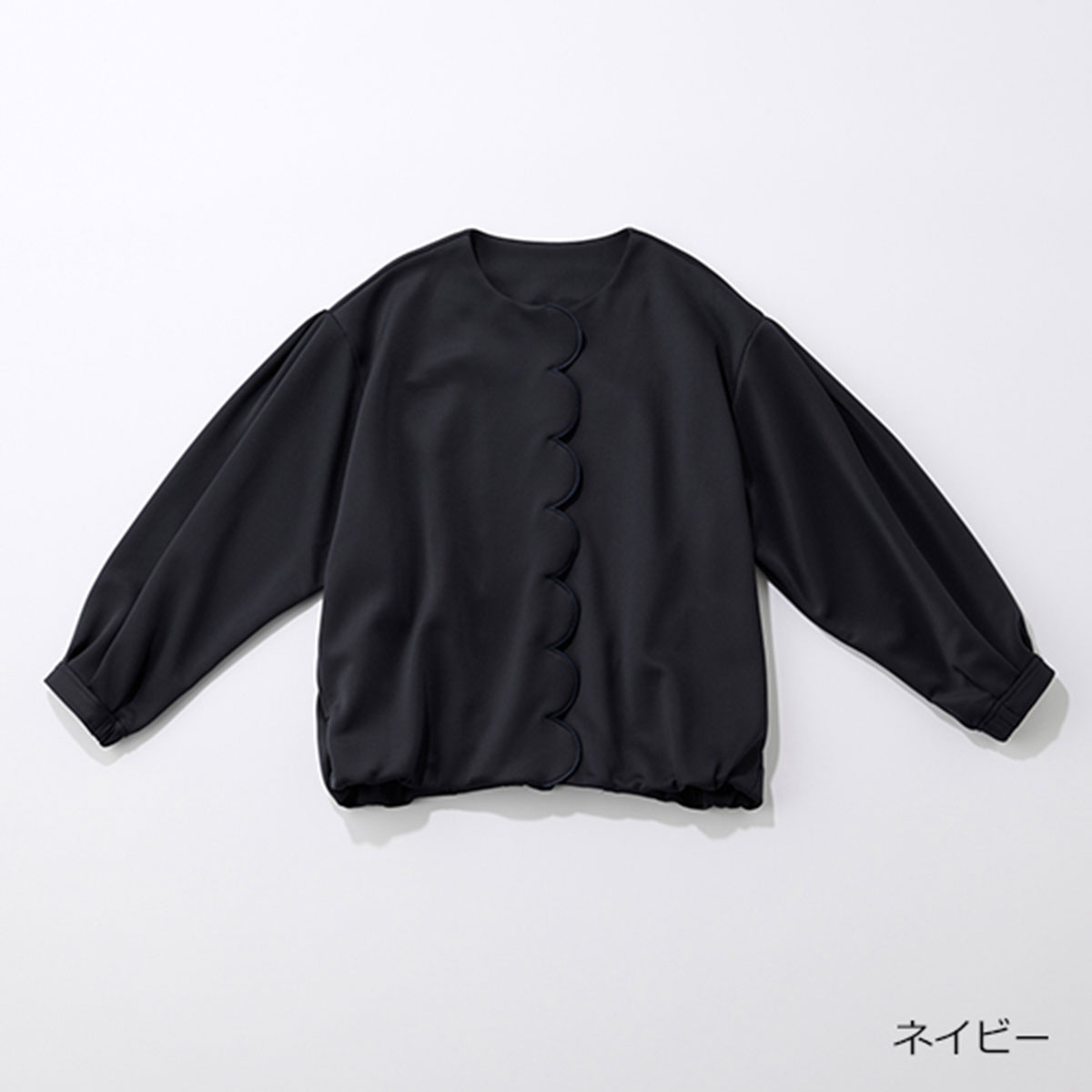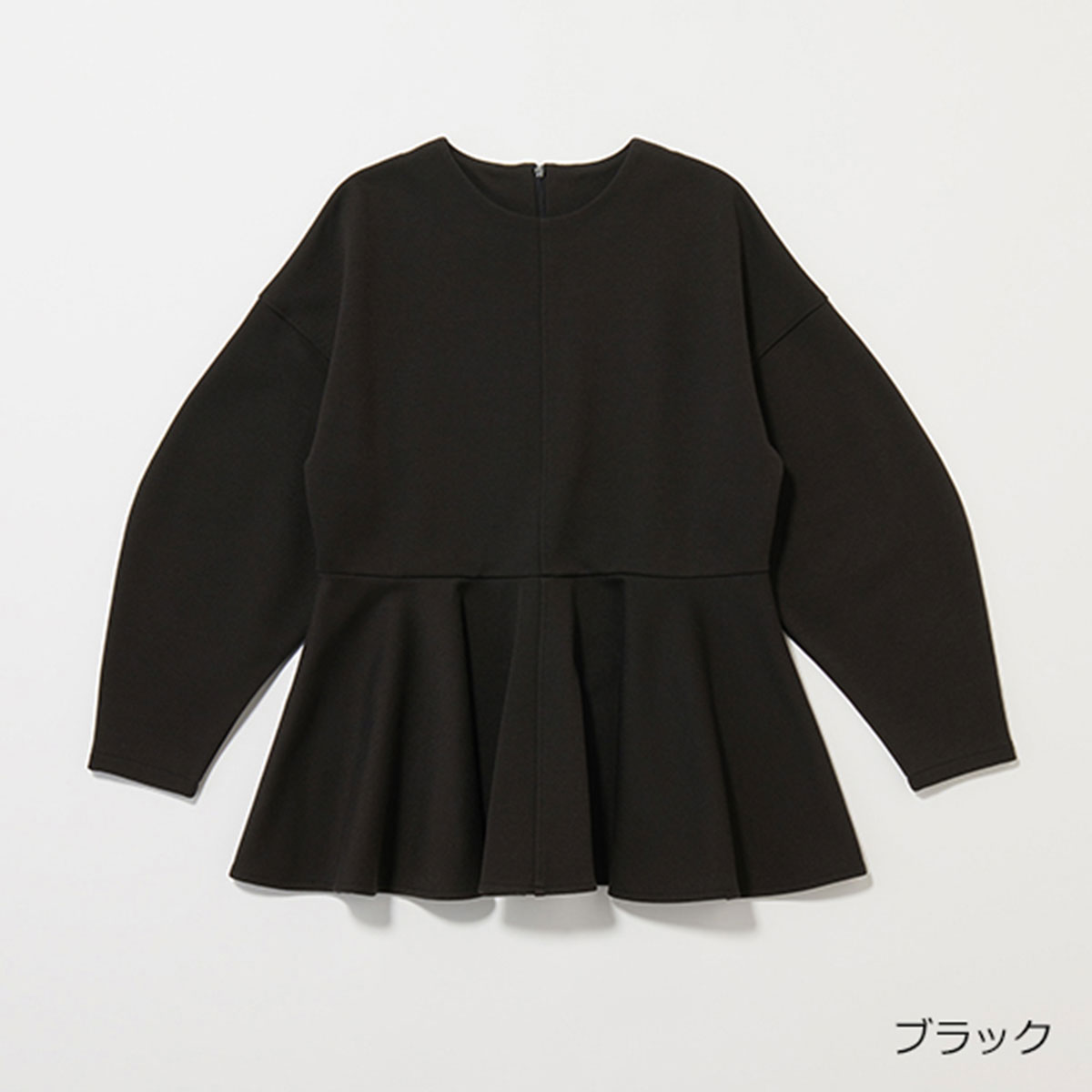 程良い肉厚感のあるポンチ素材を使用。裾を同素材でペプラム切り替えをしたデザイン。袖は構築的なボリュームスリーブにして普段着感をなくしました。家で手洗い可能。