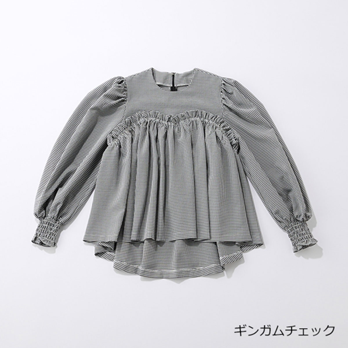 肩口にギャザーを入れてふんわりさせたり、袖口にもフリルを足して、とことんレディな雰囲気に。