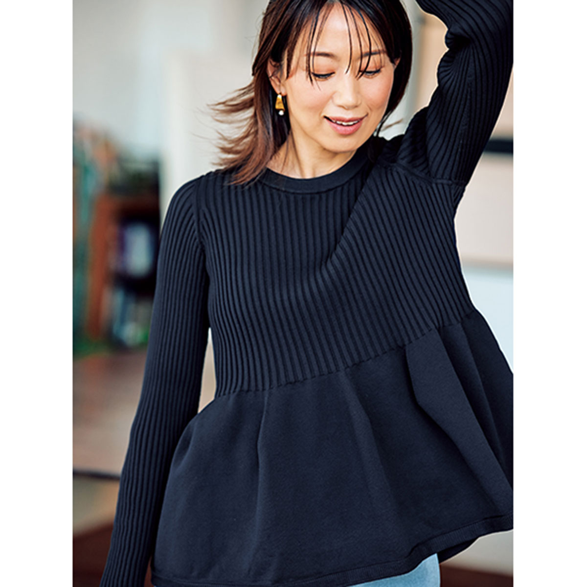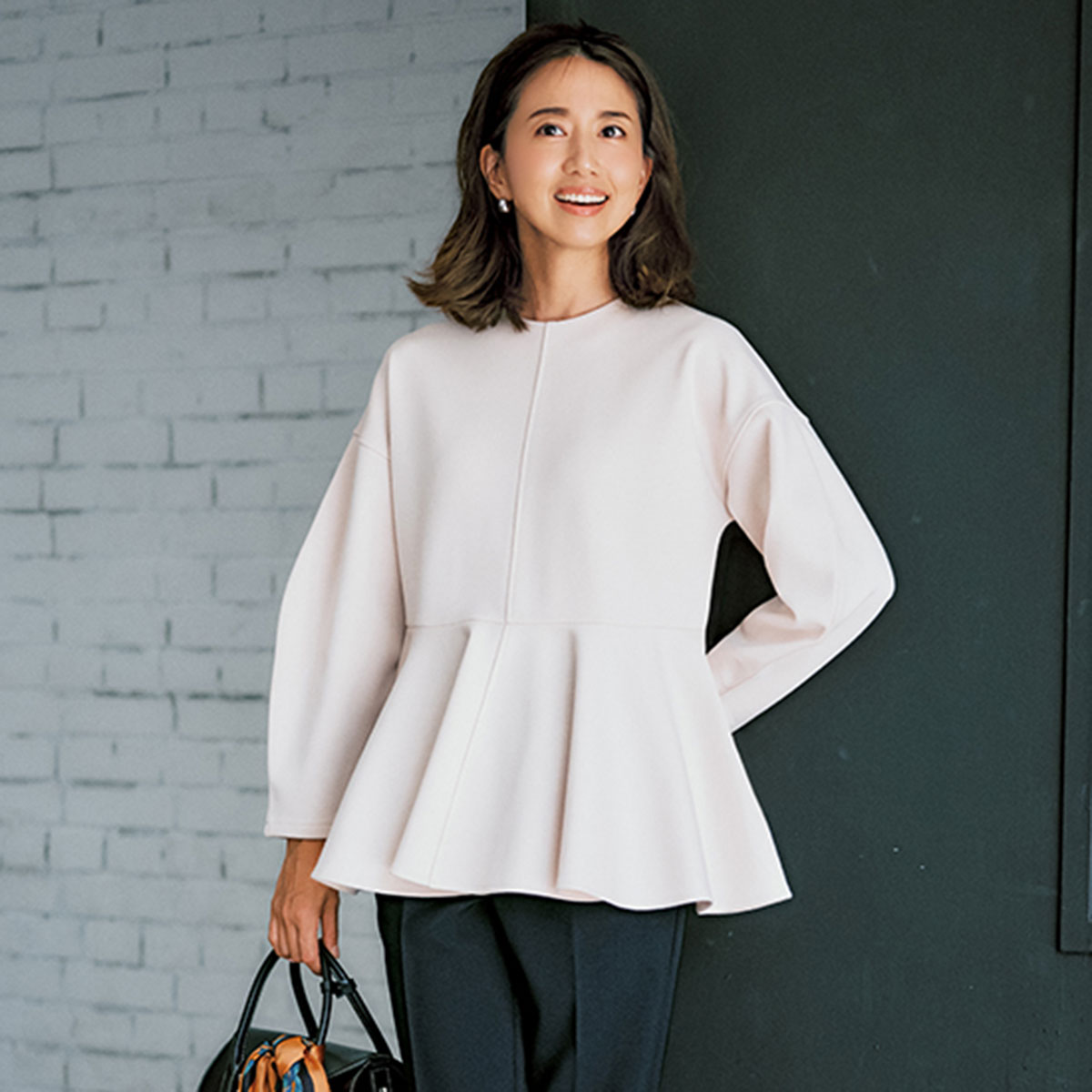体のラインを拾わないシルエットなのに、絶妙な切替位置や直線感できれいめ印象フロントのシーム、高めにしたペプラムの切り替え位置がスタイルアップ効果を発揮!