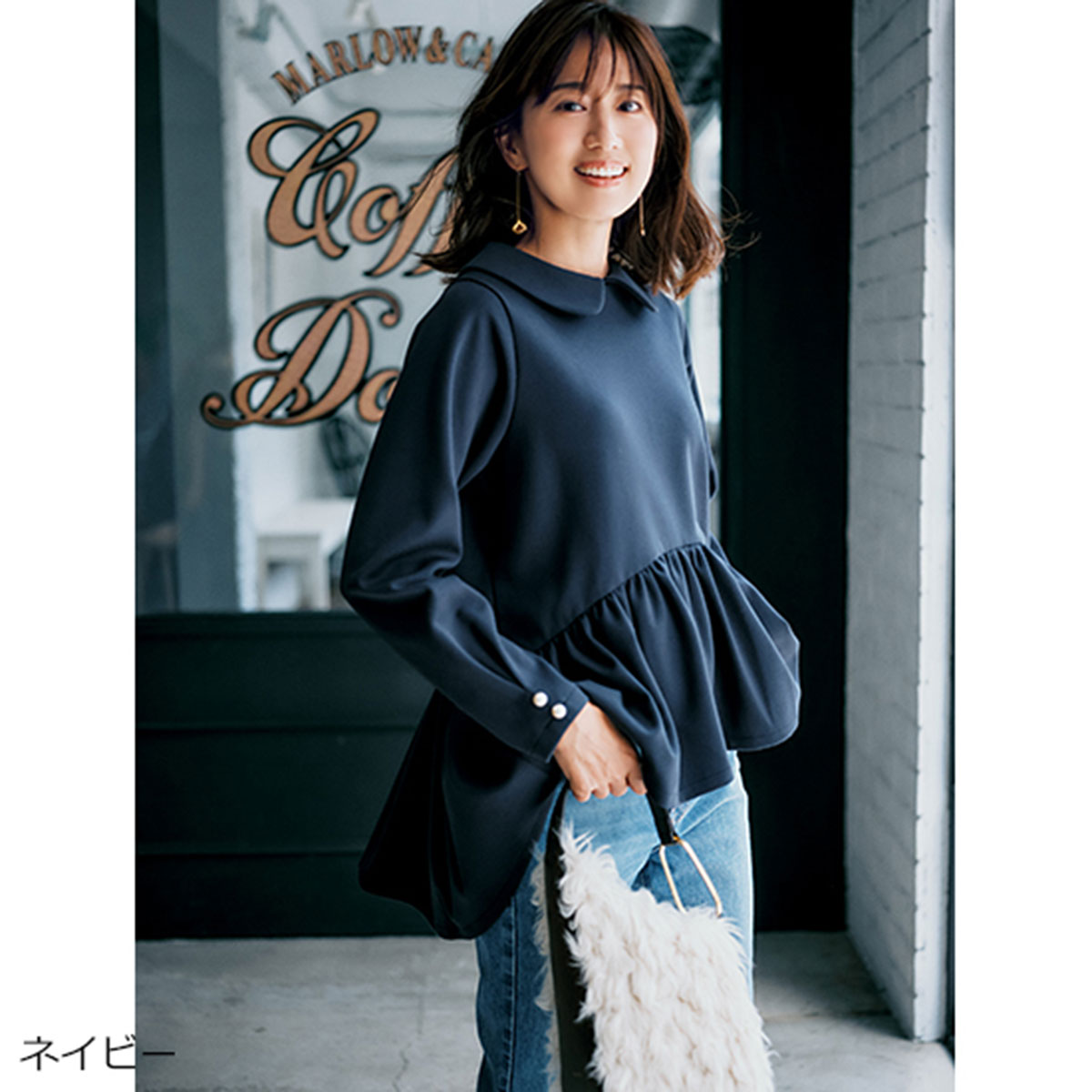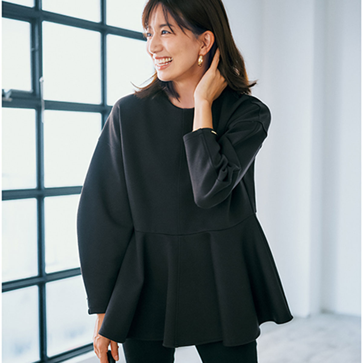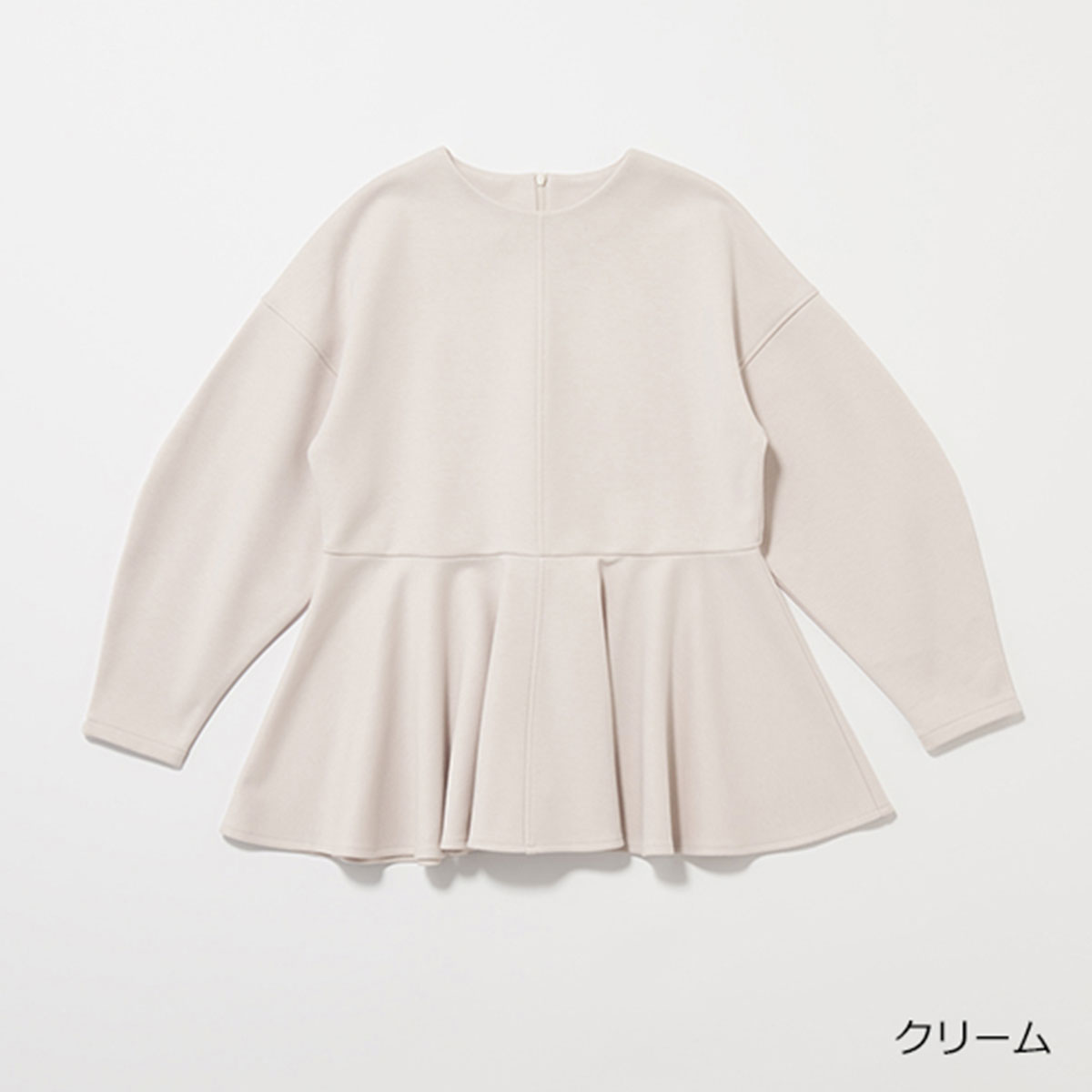 ペプラム部分は前上がり・後ろ下がりのデザインで、スタイルアップ&カバー効果も。合わせるボトムスをきれいめに替えれば参観日なども対応可能。