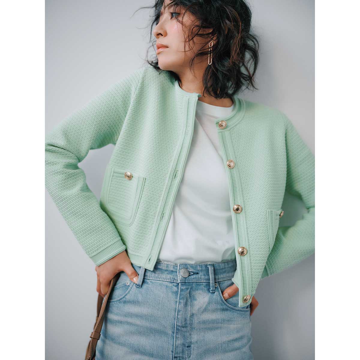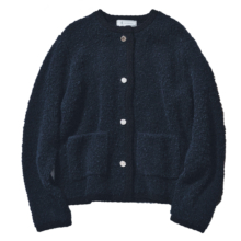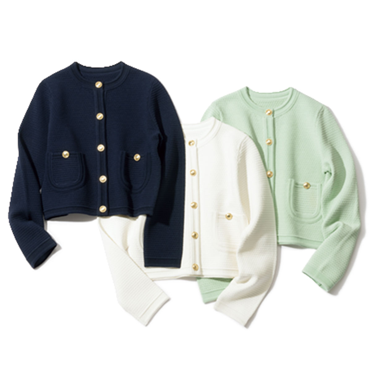 ラーベン編みならではの凹凸がツイード風の高級感を演出。ブランドオリジナルの上品な金釦はコーデのアクセントに。水洗い可。
