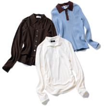 衿・袖口・裾は細かなリブ風素材だから、どことなくカジュアル感も漂うのがこのトップスが大げさにならず使いやすい理由の一つ。