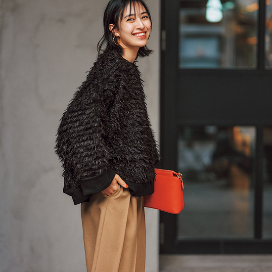 シャギーのフサフサした質感で華やかさがありつつ、オーバーサイズのシルエットが抜け感を演出。パンツだけでなく、Iラインスカートとも好相性で、大人のホリデースタイルに。