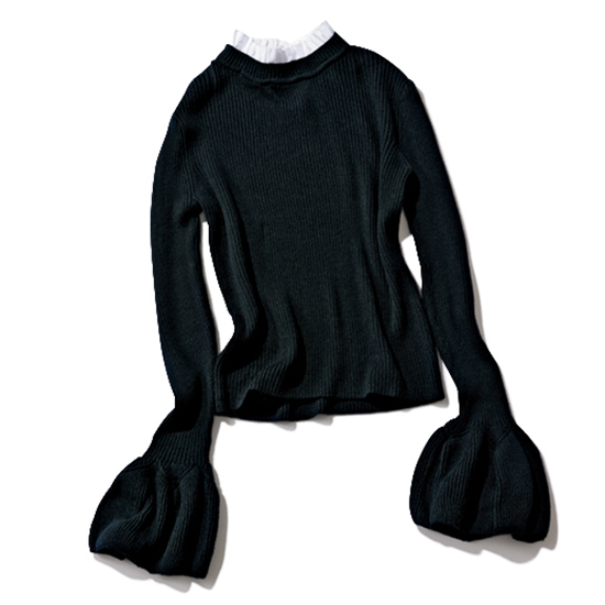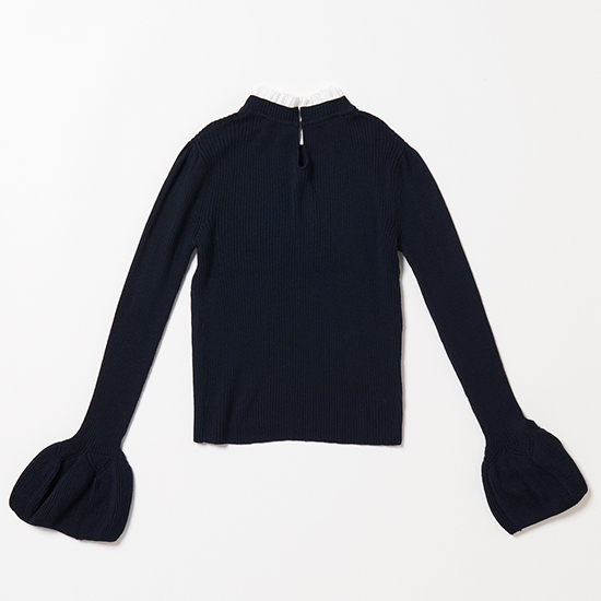 フリル衿は取り外し可能。2WAYで楽しめるウォッシャブルニット。白衿はシャツ重ね風の端正さを演出。袖口はフレアで華やか。ふっくらスポンディッシュなリブ編みで着心地も快適。