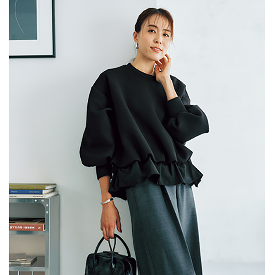 ブラック:ブラックスウェットの裾に、同色のタフタ素材をドッキング。色味を抑えることで、華やぎあるフリルも大人仕様に。