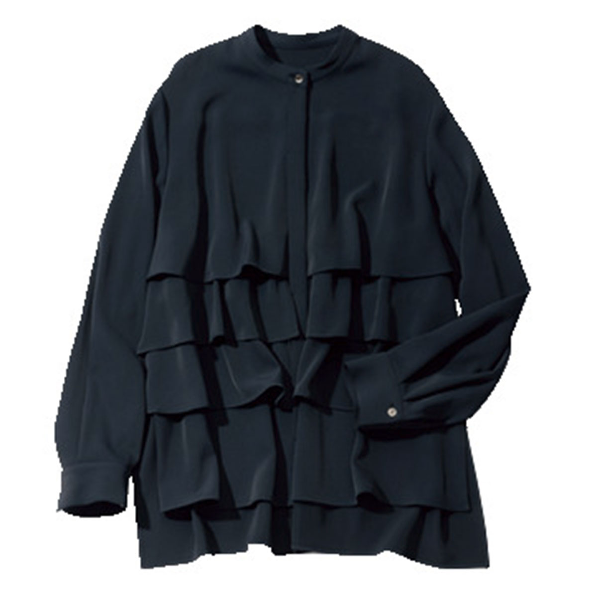 高密度なバックジョーゼット素材のほどよく厚めな質感は、透けにくく体のラインを拾わず優秀。ブラウスはレイヤードフリルとハンサムなバンドカラーの絶妙なバランスが、甘すぎない大人の洗練を演出します。ウエストアウトで丈長めで着ることも、一段だけウエストインして短丈で着用することも可能な2WAY仕様。