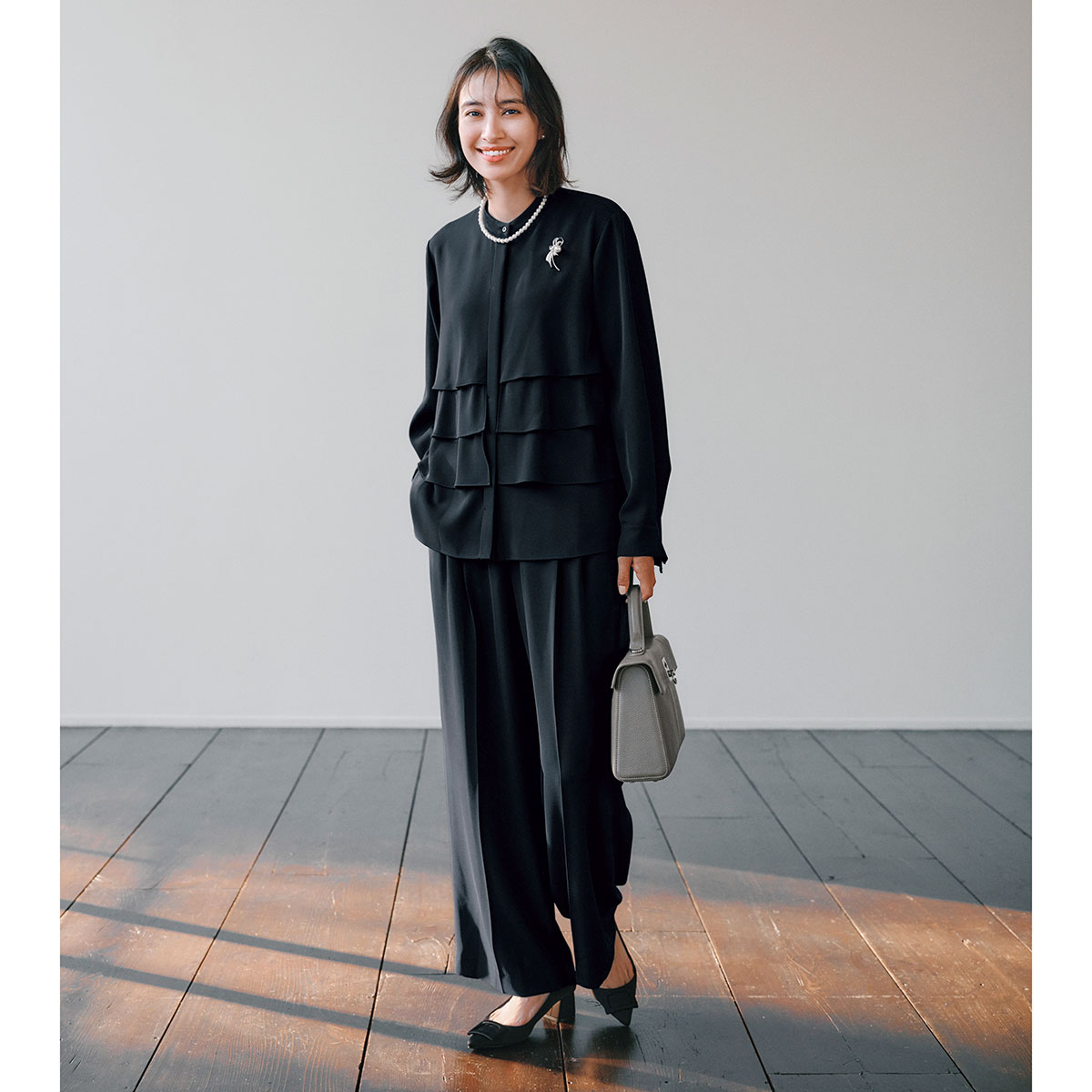 ブラウス ¥17,930〜¥19,030パンツ¥19,910〜¥21,010※サイズによって価格が異なる(ともに組曲)ブローチ¥7,700ネックレス&ピアス[セット販売]¥3,850(ともにVSセレクション)バッグ¥107,100(カフネ/カフネ カスタマーサポートセンター)パンプス¥28,600(ツル バイ マリコ オイカワ)