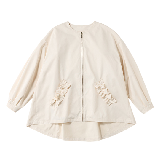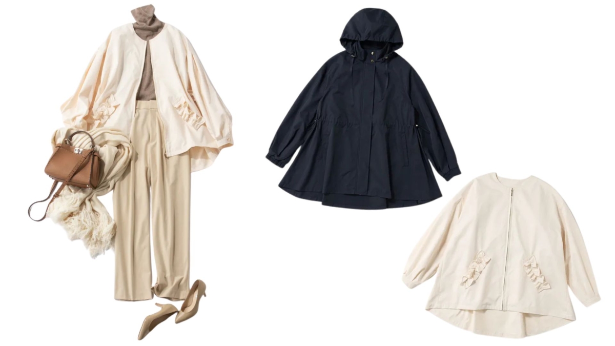 新生活のスタートで慌ただしい朝には、甘ディテールが効いたアウターが優秀。ロンT×デニムに合わせても、アイボリーの柔らかさとフリルの華やかさで、手抜き感なく品良く決まります。前後差のある着丈は、自転車移動のママも動きやすくて実用的。撥水素材で天候が不安定な春先も安心です。