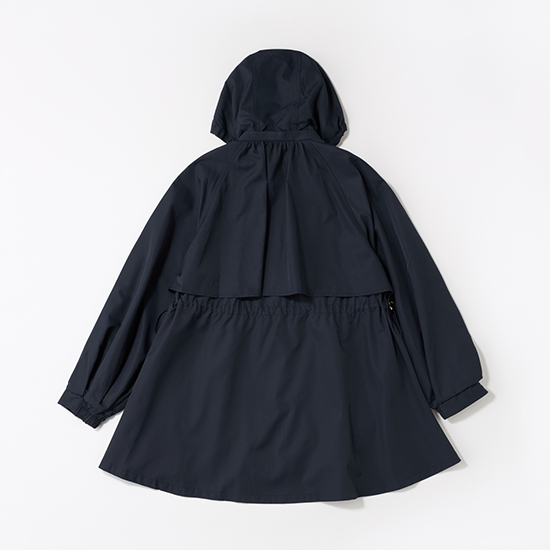 360度どこから見ても華やかで、存在感のある一枚。シンプルながらもポケットのさりげないフリルがアクセントになったフロントに、バックスタイルは背中から袖にかけたフリルが印象的なアウター。前後差のある丈が気になるヒップラインを自然にカバーし、スタイルアップ効果も。撥水素材で軽い雨にも対応でき、自宅で水洗いできるイージーケア仕様なのもうれしいポイント。¥20,900