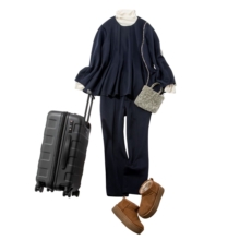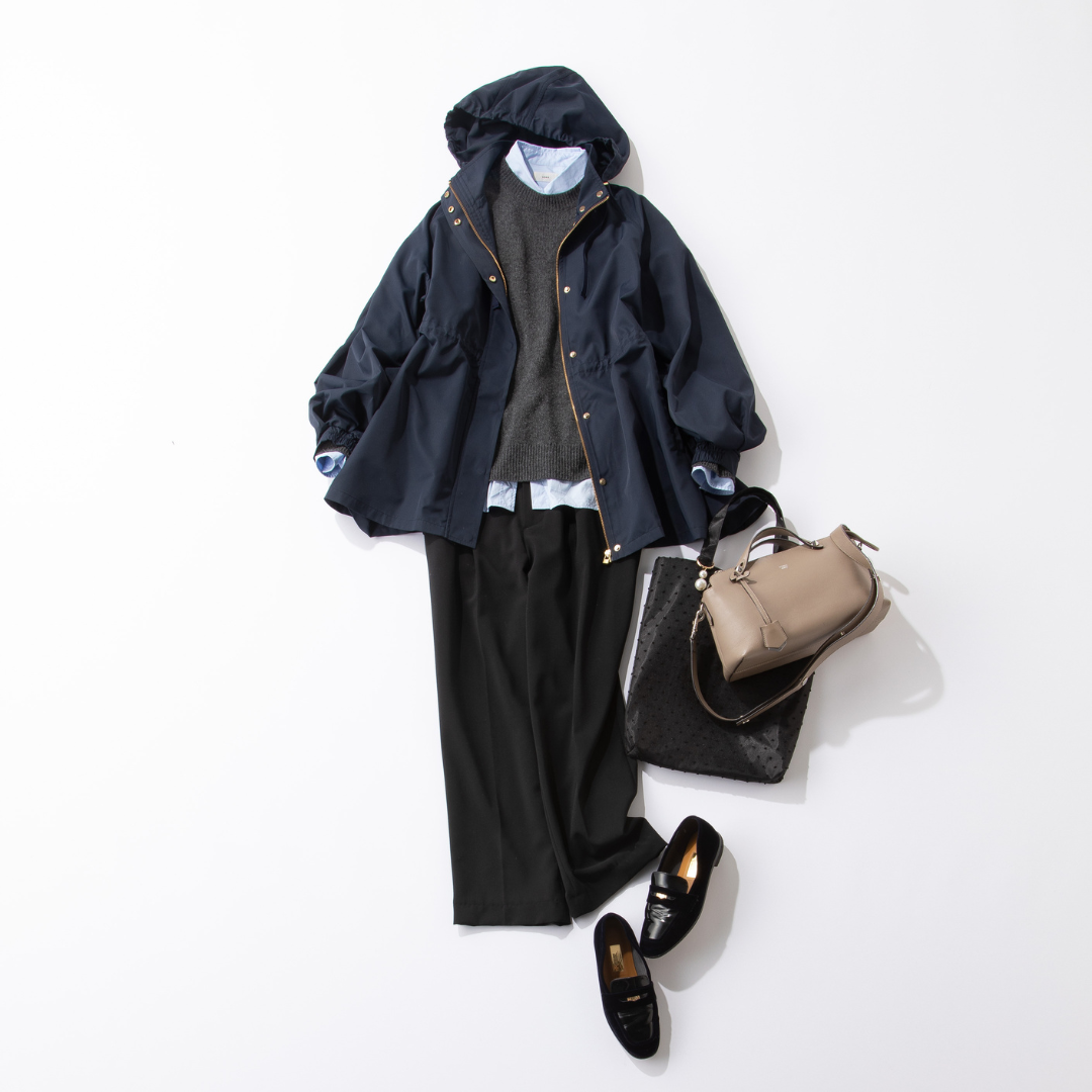 軽くて動きやすいマウンテンパーカーは、落ち着いたネイビーならきちんと感が欲しい送迎からそのまま出勤の日にも頼れる一枚です。ウエストのドローストリングでバランスを調整すれば、シルエットにメリハリが生まれて、きれいめコーデとも好相性。寒さが残る今の時期、ニットなどの冬コーデに羽織っても、シャカシャカ素材のおかげで重たさを中和し、ほどよい抜け感が生まれます。防寒しながらも、春を先取りした軽やかなきれいめコーデに。