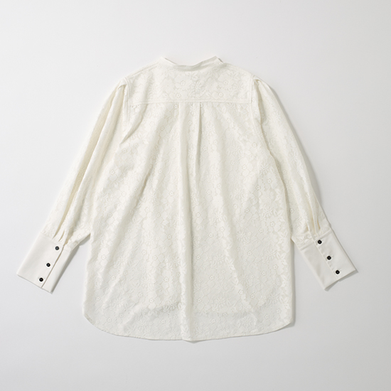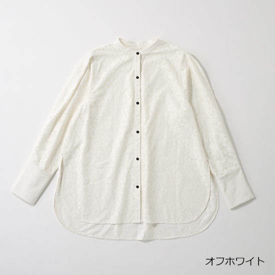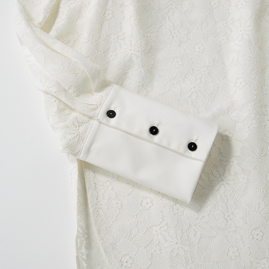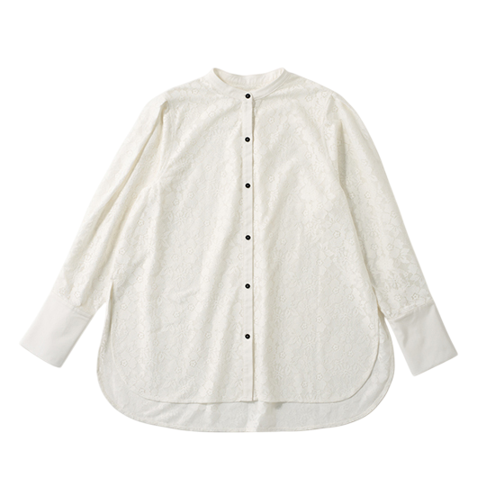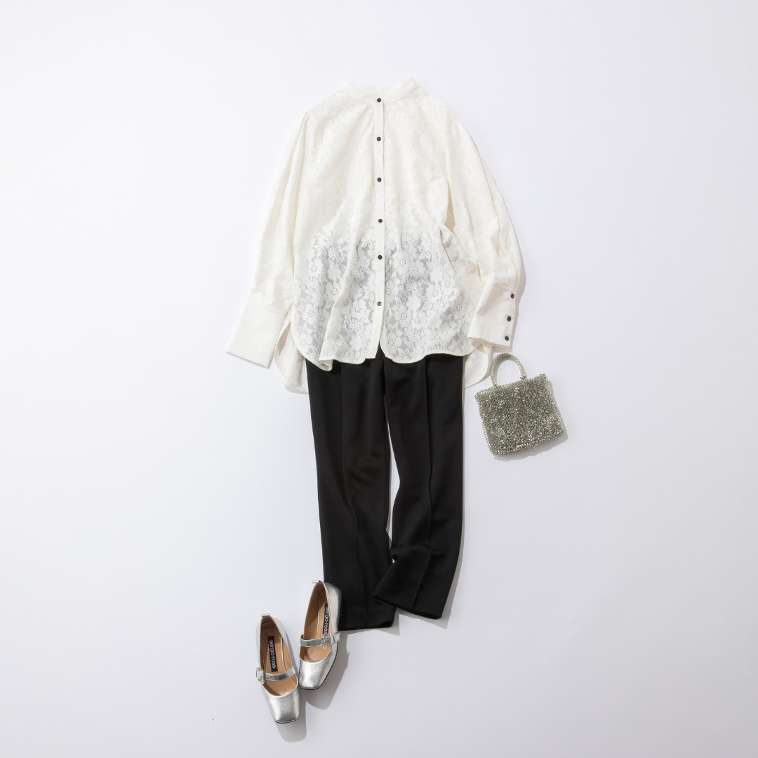 春気分を高めてくれる繊細な花柄レースのブラウス。端正なシャツディテールが効いているので甘くなりすぎず、入園前の説明会や保護者会などのきちんとシーンに最適です。長めの着丈で気になる腰回りをカバーしてくれるのもうれしいポイント。黒パンツ合わせでも、レースの軽やかさと黒ボタンがアクセントとなりこなれた雰囲気に。仕上げにシルバー小物を合わせれば、品の良さをキープしながらも春ムードを楽しめます。