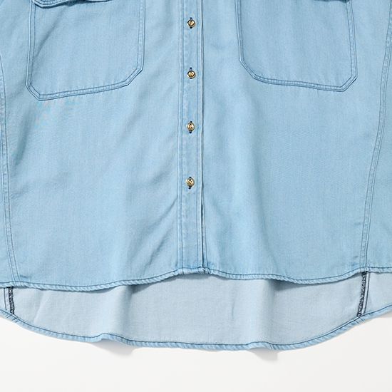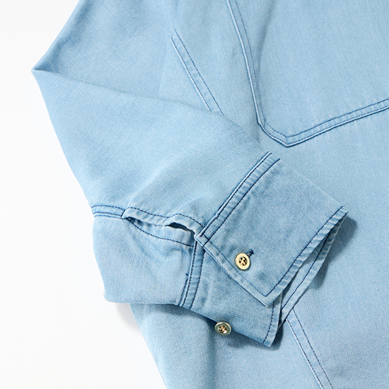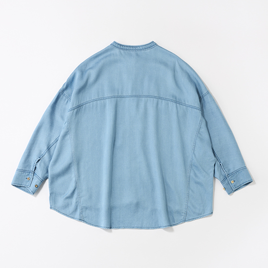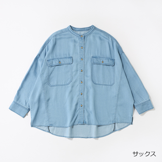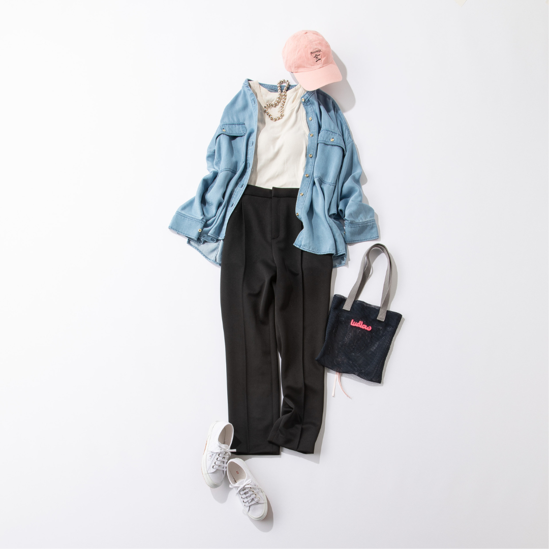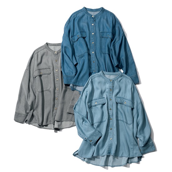 柔らかく、とろみのあるテンセル素材とクリーンなサックスカラーで軽やかな印象のデニムシャツなら、黒パンツ合わせでも一気に春らしいカジュアルコーデに。上半身を爽やかなカラーでまとめて、アクセントに遊び心のあるカラー小物をプラスすれば気分もあがってマンネリ解消。羽織りとしてだけでなく、タートルネックをインしてボタンを閉めれば今の時期からトップスとしても着られます。