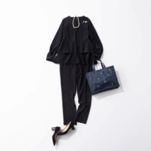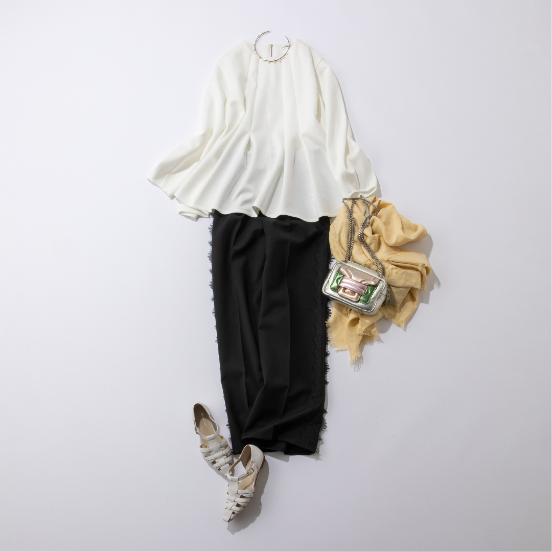 春に欲しくなる白トップスは、ほんのり甘さのあるものを選べば、新生活にうれしい好印象を演出できます。サイドに旬のレースをあしらった黒パンツを合わて、定番のモノトーンコーデもぐっと今っぽく更新。春らしいカラーの小物をプラスして友達とのランチにもぴったりな華やかで洗練された装いに。ダンボール素材ならではの、ほどよいハリでキレイ見えするので、ボトムス次第で通勤や母業にも着回せる優秀な1枚です。