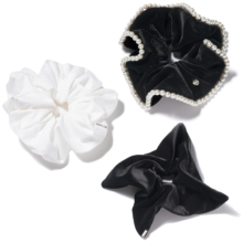 髪を優しくまとめてくれる柔らかなゴム素材。サテン地とオーガンジー素材をMIXした小さめのリボンで、普段使いからオケージョンまで幅広く活躍。