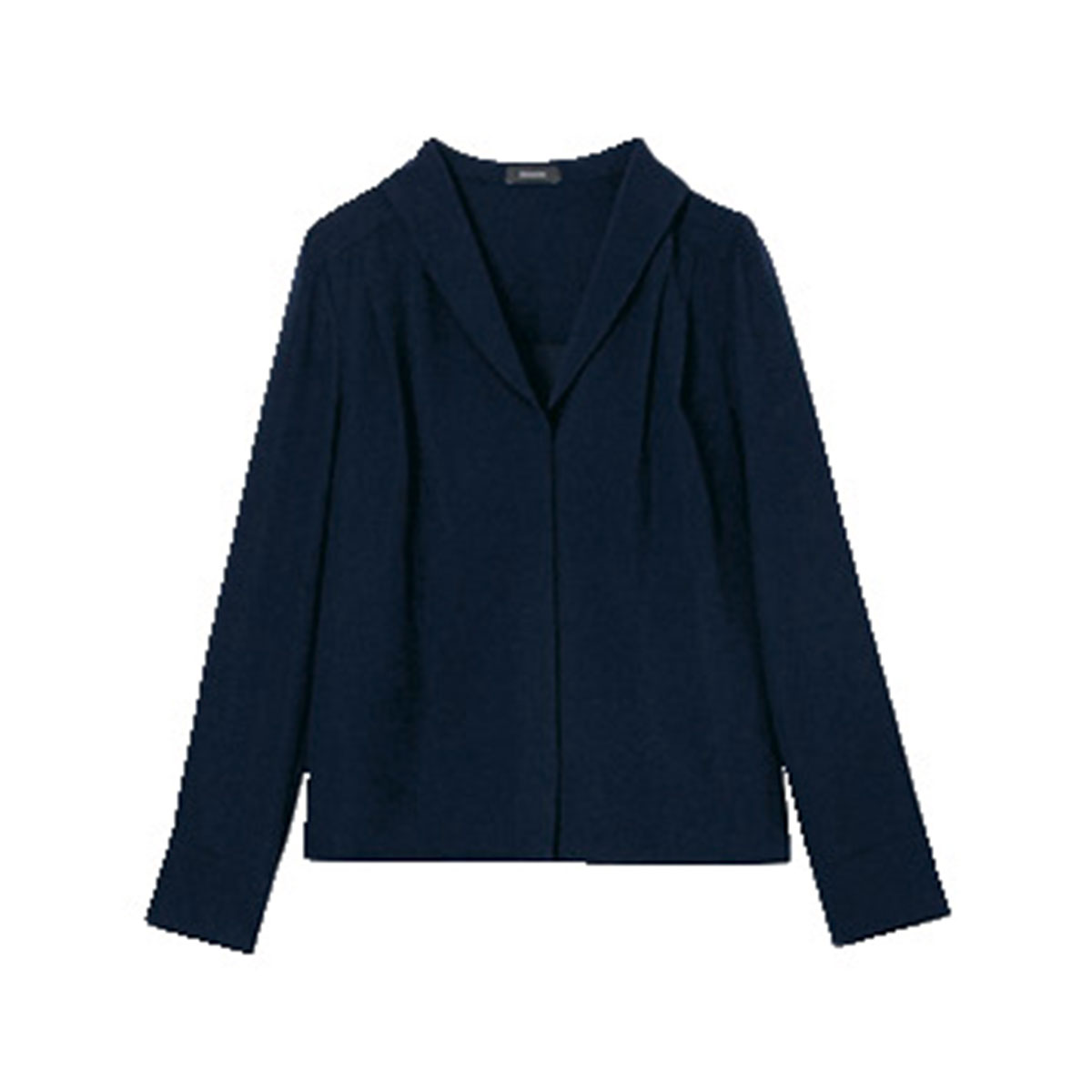 光沢感のあるとろみ素材を使用。縦長Vネックのショールカラーが顔周りをすっきり見せてくれる。シワになりにくく、洗濯機洗いも可。