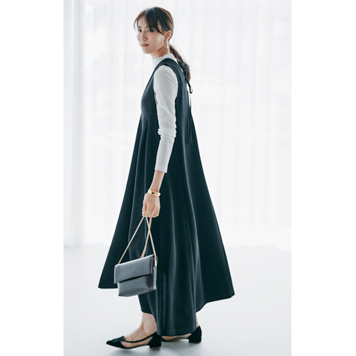 ジャンパースカート¥20,900(スリースクエア)カットソー¥17,600(オスロ―/フィルム)バッグ¥5,990(マンゴ)パンプス¥35,200(ファビオ ルスコーニ/伊勢丹新宿本店 本館2階 婦人靴)ピアス¥19,360〈ラブ・エージェイ〉バングル¥39,160〈ソコ〉(ともにZUTTOHOLIC)