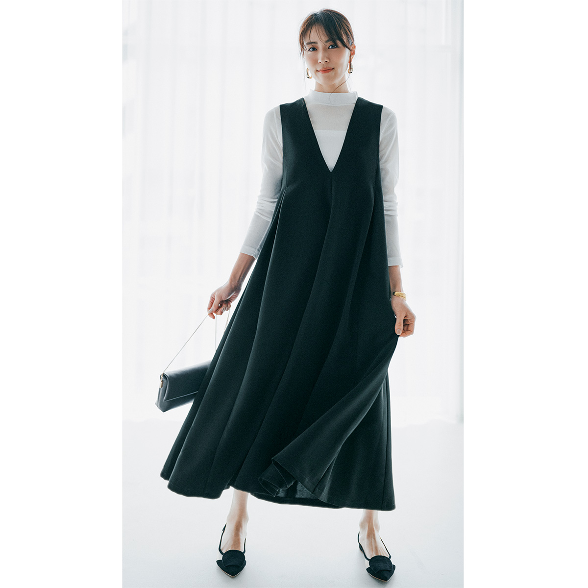 深めのVネックと量感たっぷりのフレアシルエットが特徴のジャンパースカート。落ち感のある素材は縦ラインを強調し、すっきりとした印象に。インナー次第でシーズンレスに着回せます。