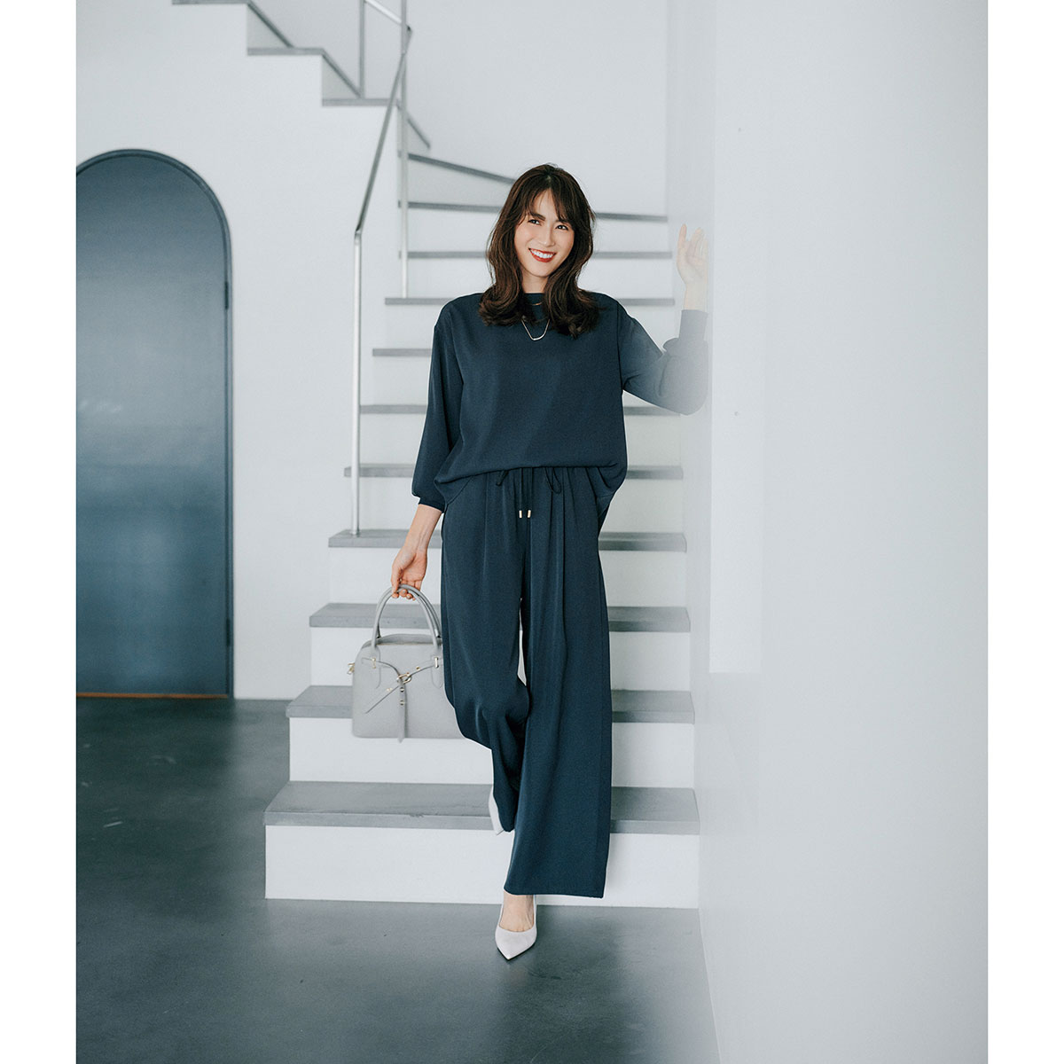 ブラウスと同素材で仕立てた上品見えワイドパンツ。ウエストは総ゴム仕様でストレスフリー。体のラインを拾いにくいゆったりシルエットながら、キレイめ感をキープ。