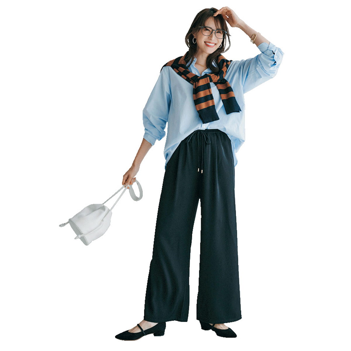 定番シャツ合わせでもドロストパンツで今っぽく更新。落ち感のあるゆるシルエットが新鮮。