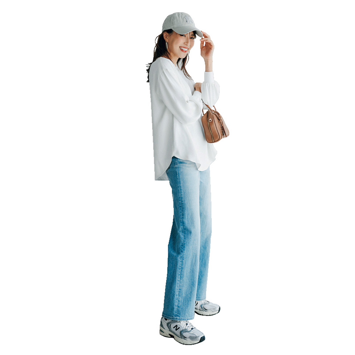 ブラウス¥9,900(エマテイラー/STYLEDOOR)パンツ¥30,800(ヤヌーク/カイタックインターナショナル)バッグ¥7,590(カシュカシュ/アンビリオン)スニーカー¥12,980(ニューバランス/ニューバランスジャパンお客様相談室)キャップ¥4,620(ニューエラ)ピアス¥8,800(アビステ)