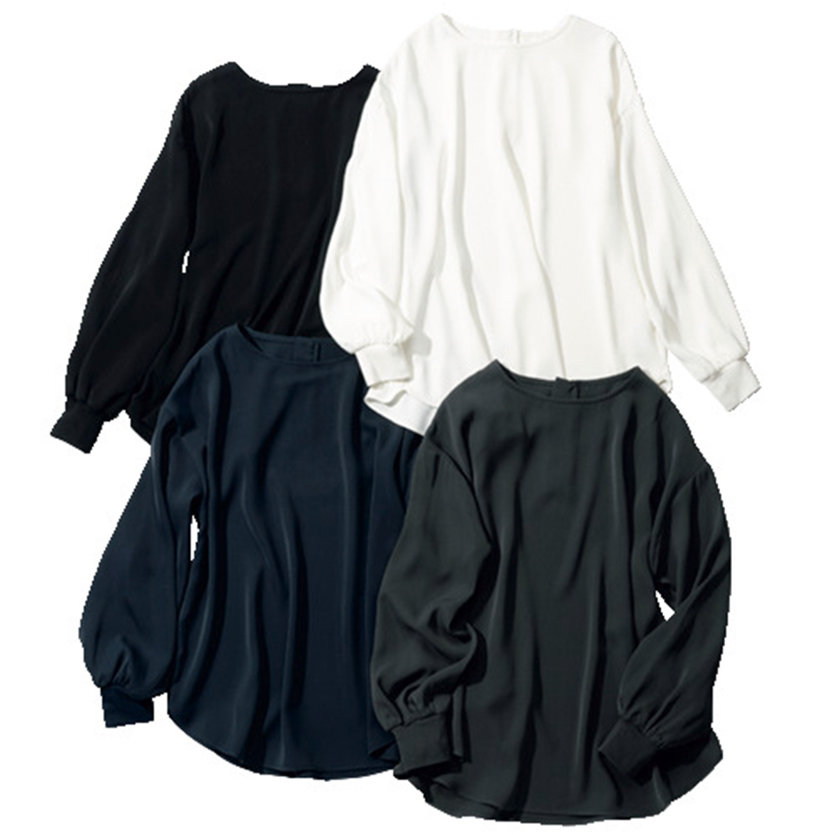 ラフになりすぎない上品大人カジュアルにも!Tブラウスの裾は前後差のあるラウンド仕様。理想的な落ち感があり、インせずともサマになります。