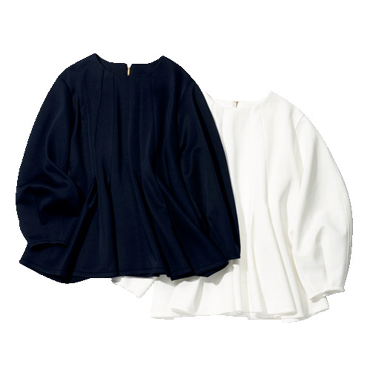 表面感のキレイなもっちりダンボール素材を使用し、カットソーの快適さときちんと感を両立。ランタンスリーブと背中のファスナーがアクセントに。