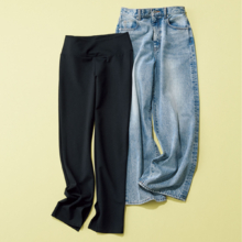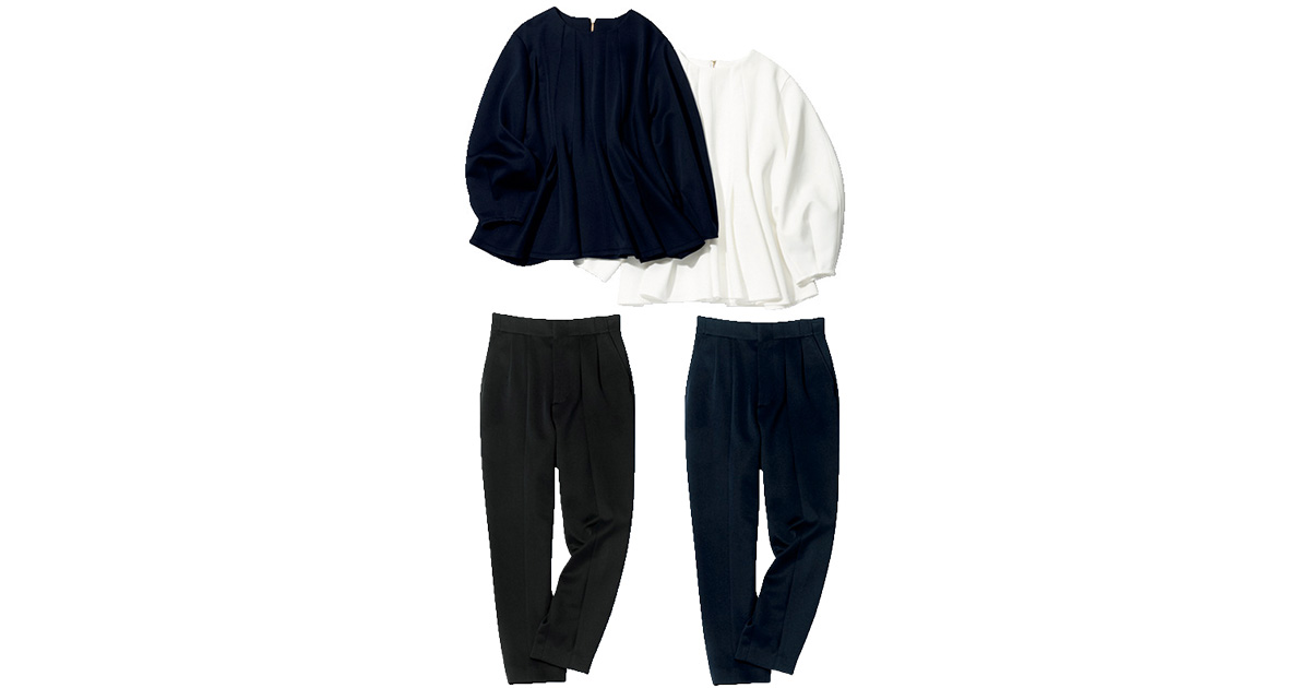 トップスと同素材、快適な穿き心地のテーパードパンツ。ウエストはゴム仕様ながら、外からは分からないキレイめデザイン。タックと切り替えでほどよいゆとりで美脚を演出。