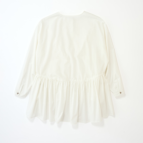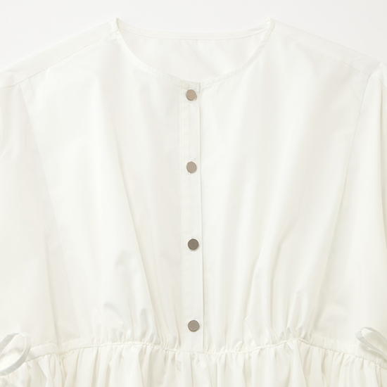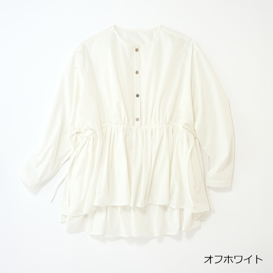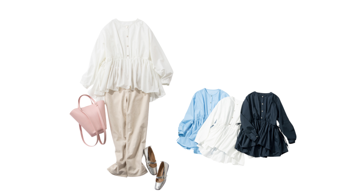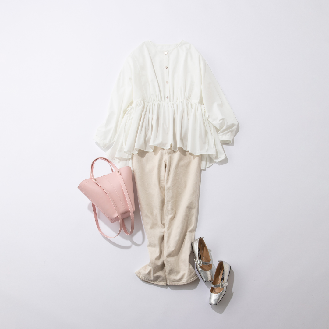 たっぷりギャザーのブラウスは軽やかなコットンポリエステル生地で、白でも甘くなりすぎず品良く決まる一着。サイドのドローコードを絞ってペプラムシルエットにすれば、スタイルアップも叶います。白デニムとの異素材合わせに、ピンクのバッグやシルバーの靴を差し色にすれば、甘派ママの心ときめく春コーデが完成。一枚でパッと華やぐから、コーデを悩む時間がない朝の送迎やオシャレしたいママ友とのランチ予定にも◎。ブラウスなのにアイロンいらずの手軽さも、デイリーに頼れるポイントです。