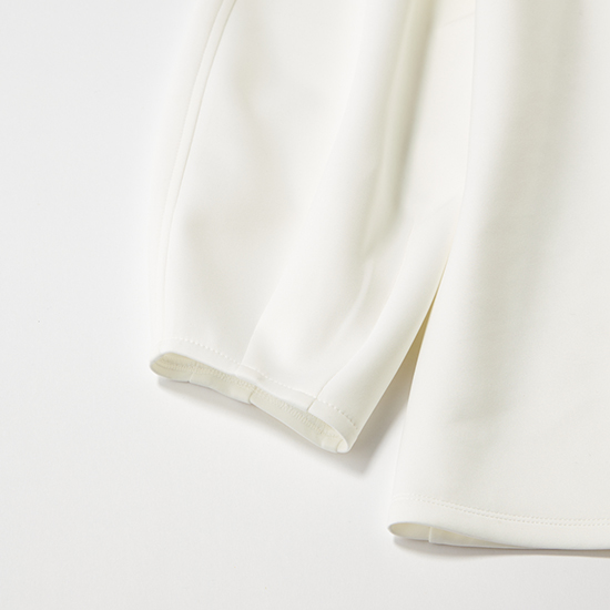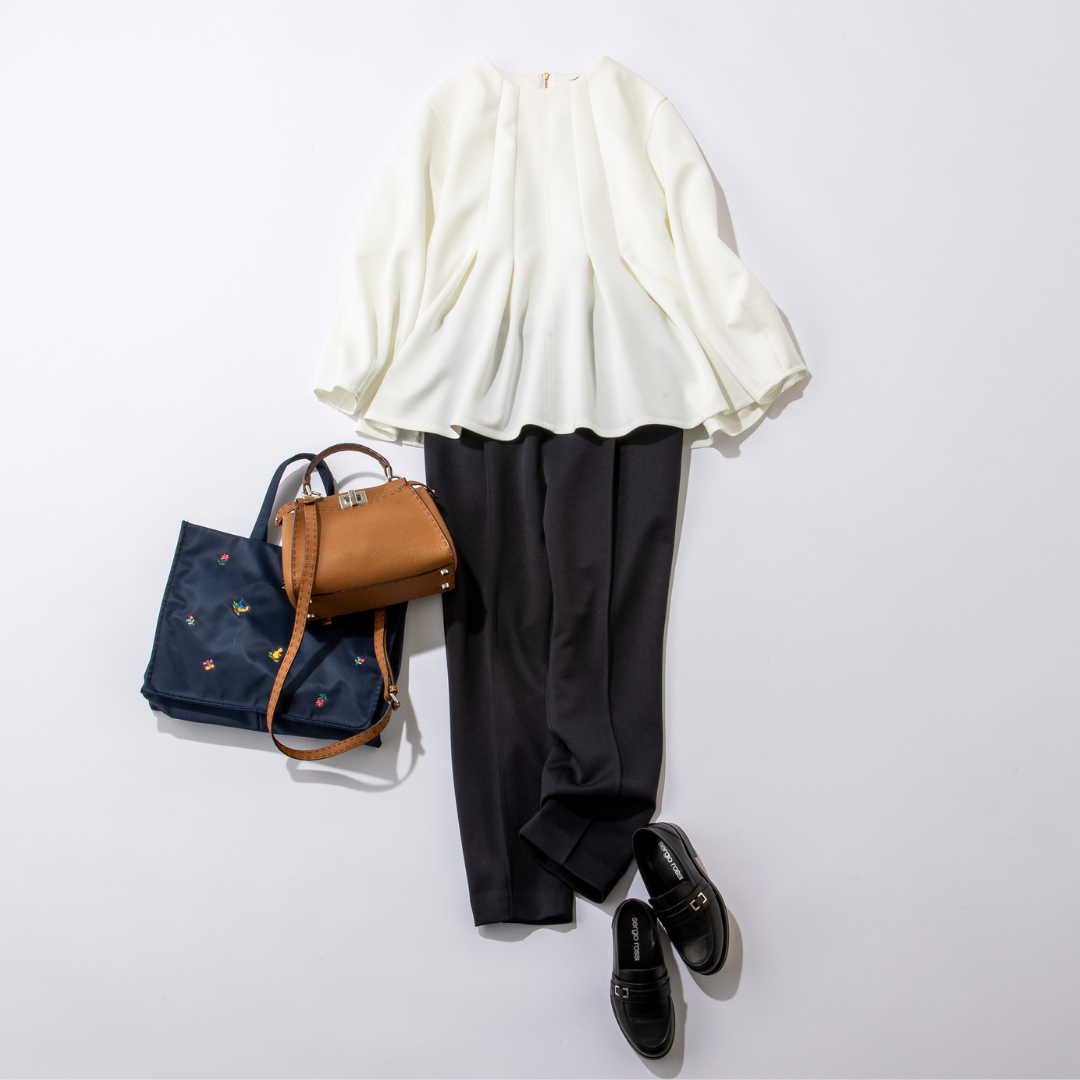 タックの入ったフレアシルエットが美しく、アイテム次第でオンオフ問わず活躍する一着。ふっくらとした生地で、身体のラインを拾いにくいのもうれしいポイントです。細身パンツと合わせれば、全体がすっきりまとまり好バランスに。白の清潔感に落ち着いたネイビーを重ねた配色は、初めましての機会が増える新生活にもぴったり。シワになりにくいので、送迎→通勤→お迎えと移動が多い日でも一日中きちんと感をキープできます。手洗いOKだからお手入れも簡単。休日はデニム合わせでカジュアルダウンするのもおすすめです。
