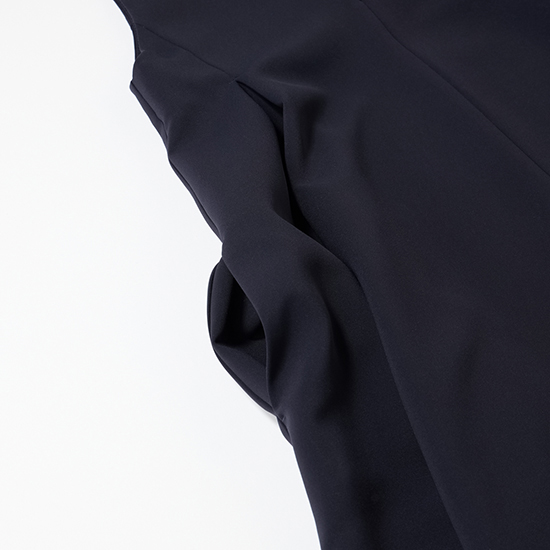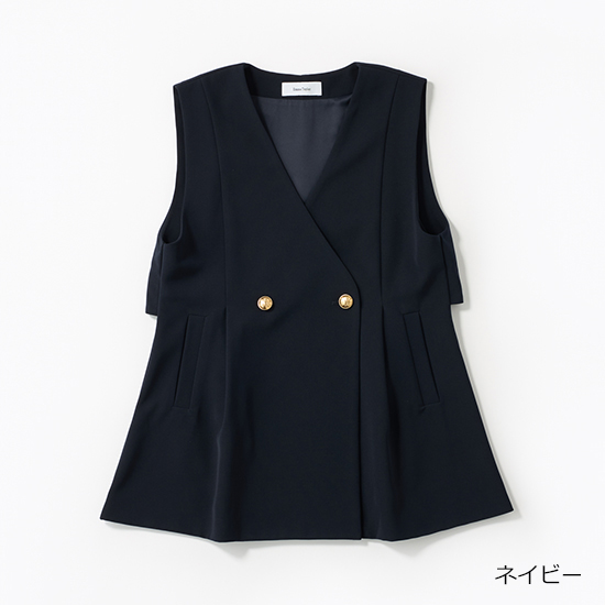ジレ×ボウタイの王道合わせには、ジレと同色のパンツでセットアップ風にすればハレの日に相応しいきちんと感が。ゴールドのダブルボタンが効いたネイビーのジレは、ペプラムシルエットで腰まわりを自然にカバーしつつクラシカルな印象。ダブルクロス素材で動きやすく、長時間の式典でも快適です。落ち着いたネイビーのワントーンに白のボウタイブラウスが品良く映えて、顔周りをパッと華やかに。アクセサリーに頼らなくても、記念撮影に自信を持って臨めます。参観日や学校行事など、きちんと見せたい日にも頼れる一着です。