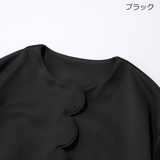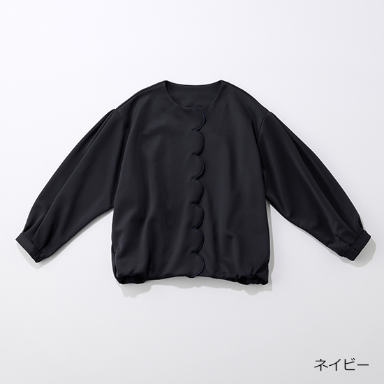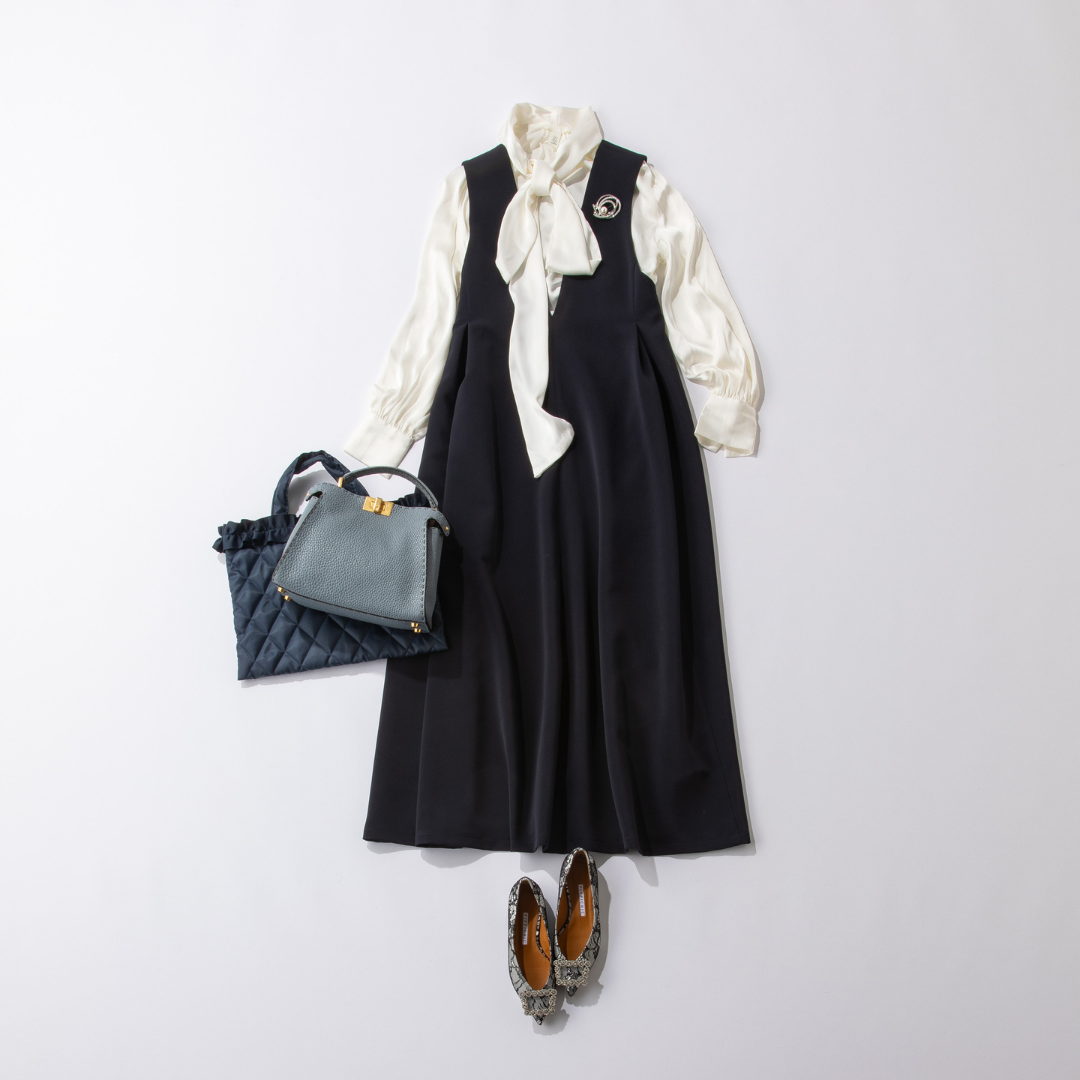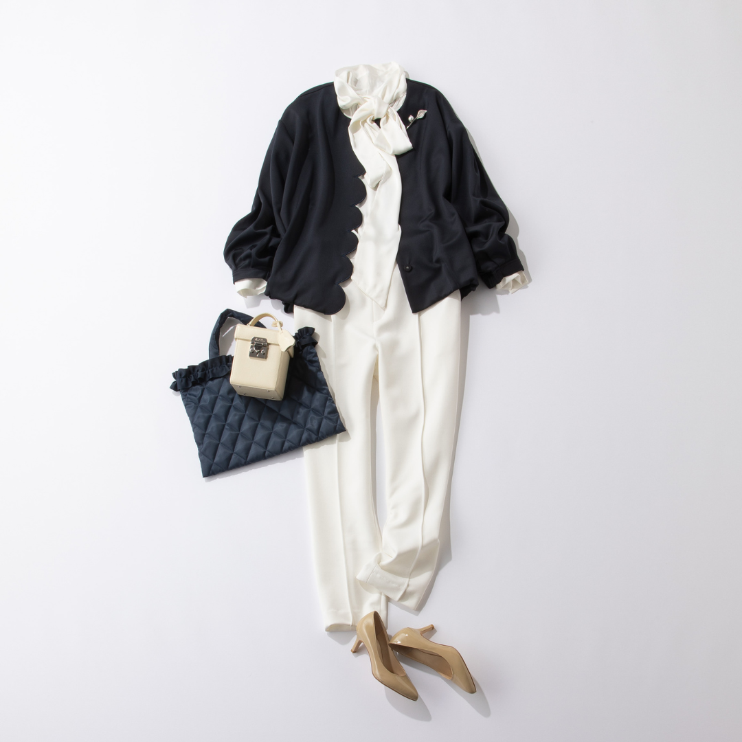 かしこまったジャケットが苦手なママには、カーディガンという選択も。ボウタイブラウスを合わせれば、ハレの日でも見劣りせずに着こなせます。フロントのスカラップデザインがさりげない華やぎを添え、なめらかな素材で式典にも好相性。上下を白でまとめて日常とは違う特別感を出し、ネイビーのカーディガンで品良く引き締めるのがポイント。自宅で水洗いできる素材だから、式典後はデニム合わせなどデイリーにも気負わずに着られます。