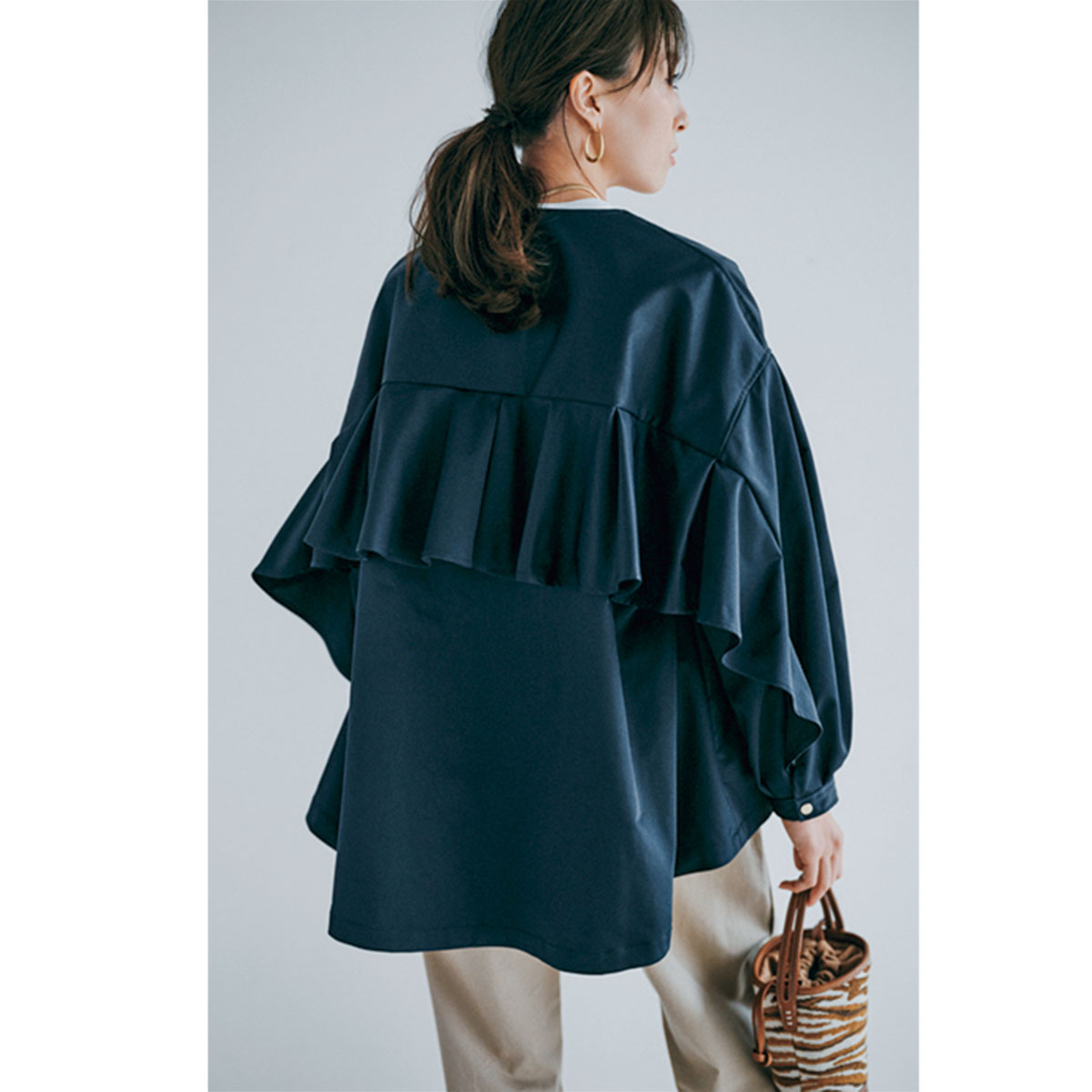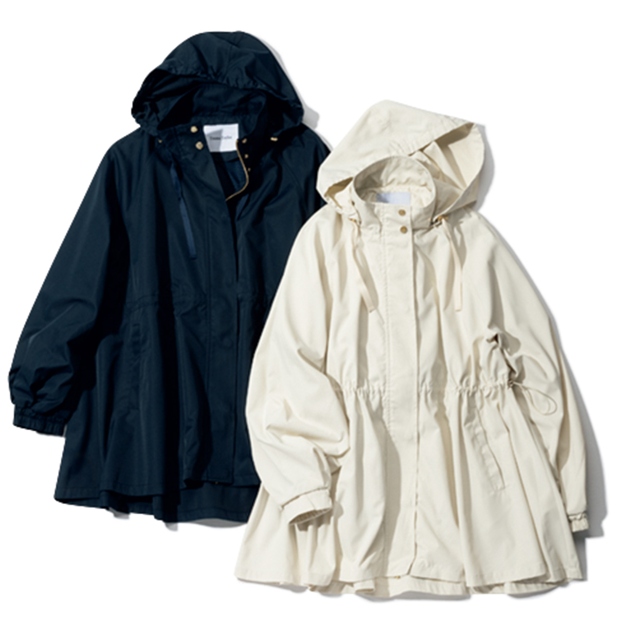 発売以来ロングセラーのコートに、春らしいアイボリーが仲間入り。背中から袖にかけて大胆に施したフリルが、羽織るだけで華やかさを演出。撥水素材で軽い雨にも対応。