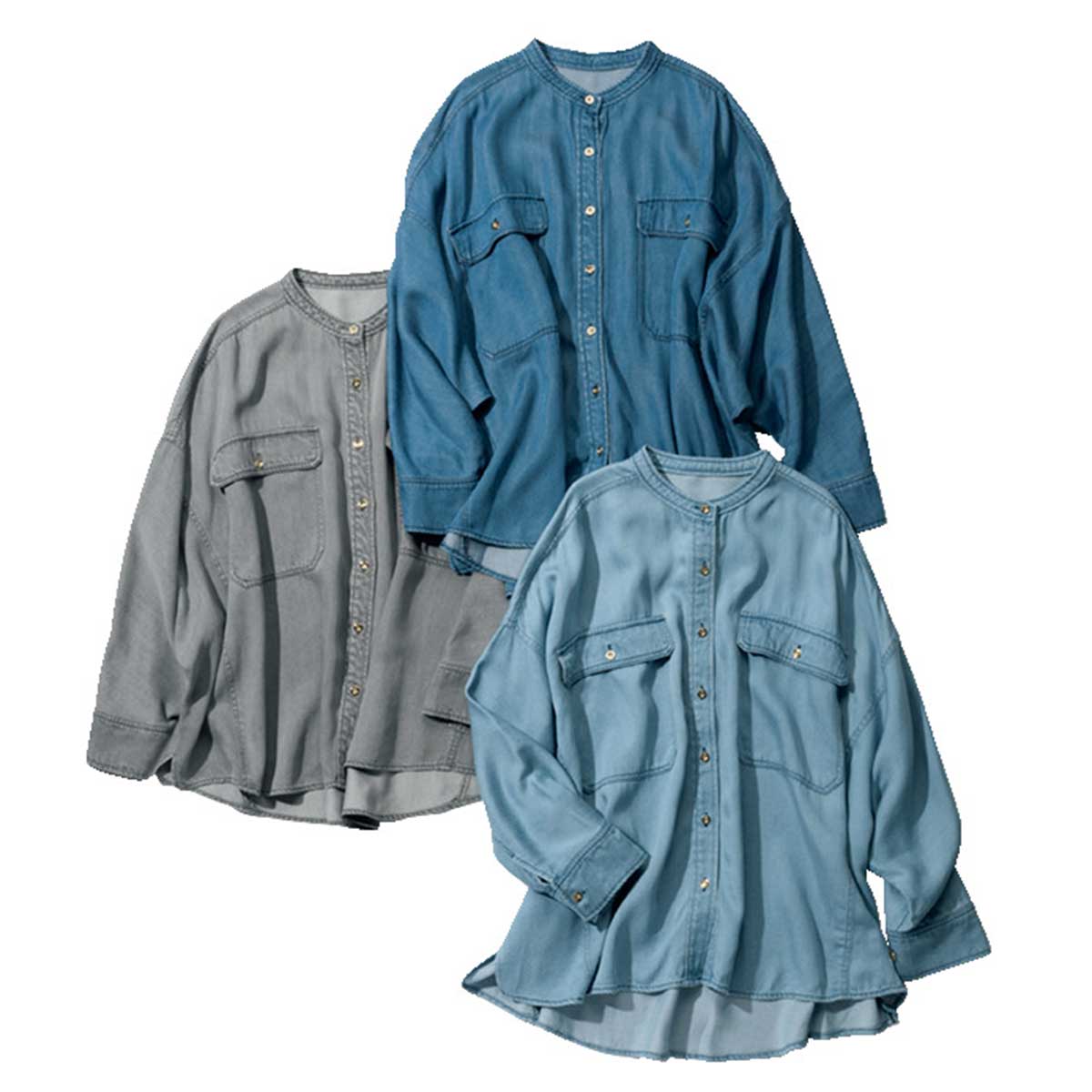 柔らかなテンセルデニムを使用したオーバーシャツ。綿デニムよりキレイめ見えで、カジュアルすぎないのが持ち味。ゴールドボタンが上品なアクセント。