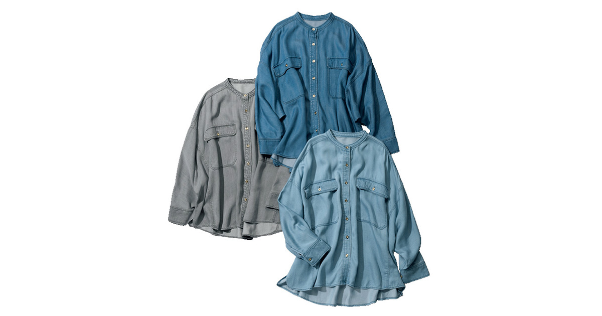 柔らかなテンセルデニムを使用したオーバーシャツ。綿デニムよりキレイめ見えで、カジュアルすぎないのが持ち味。ゴールドボタンが上品なアクセント。